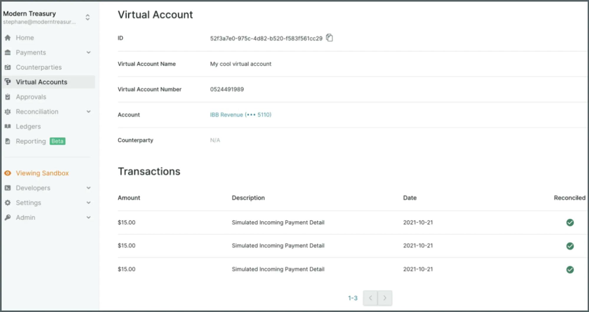 Modern Treasury allows companies to programmatically generate virtual accounts and assign them to users, invoices, or other entities. Using virtual accounts, companies can gain visibility and streamline the reconciliation of payments. Each transaction features an Incoming Payment Detail object that provides necessary data for accurate reconciliation, including a transaction code and a virtual account number. Customers can route payments into virtual accounts via ACH, wire, and RTP through a single integration.
