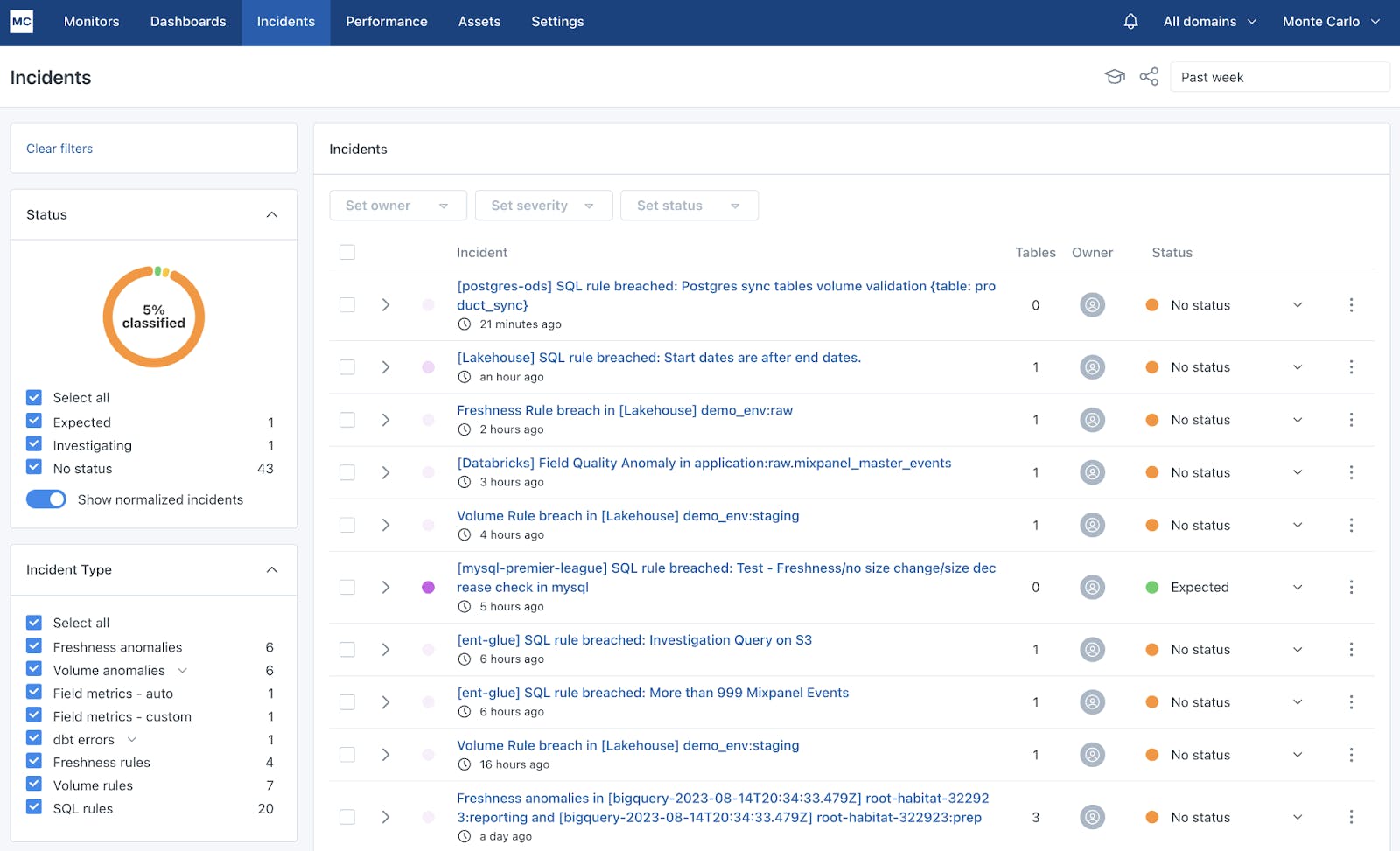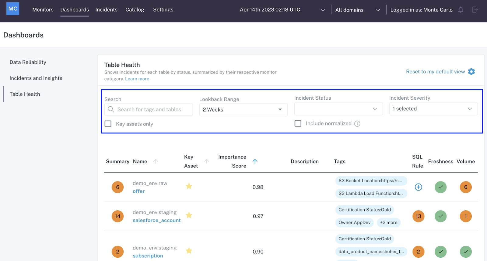 Table Health Dashboard: This dashboard provides an overview of the data quality of all objects within a data lake or data warehouse. It identifies incidents and data anomalies caught by Monte Carlo, displaying the incident status and severity. Columns like SQL Rule, Freshness, and Volume indicate possible sources of data anomalies.