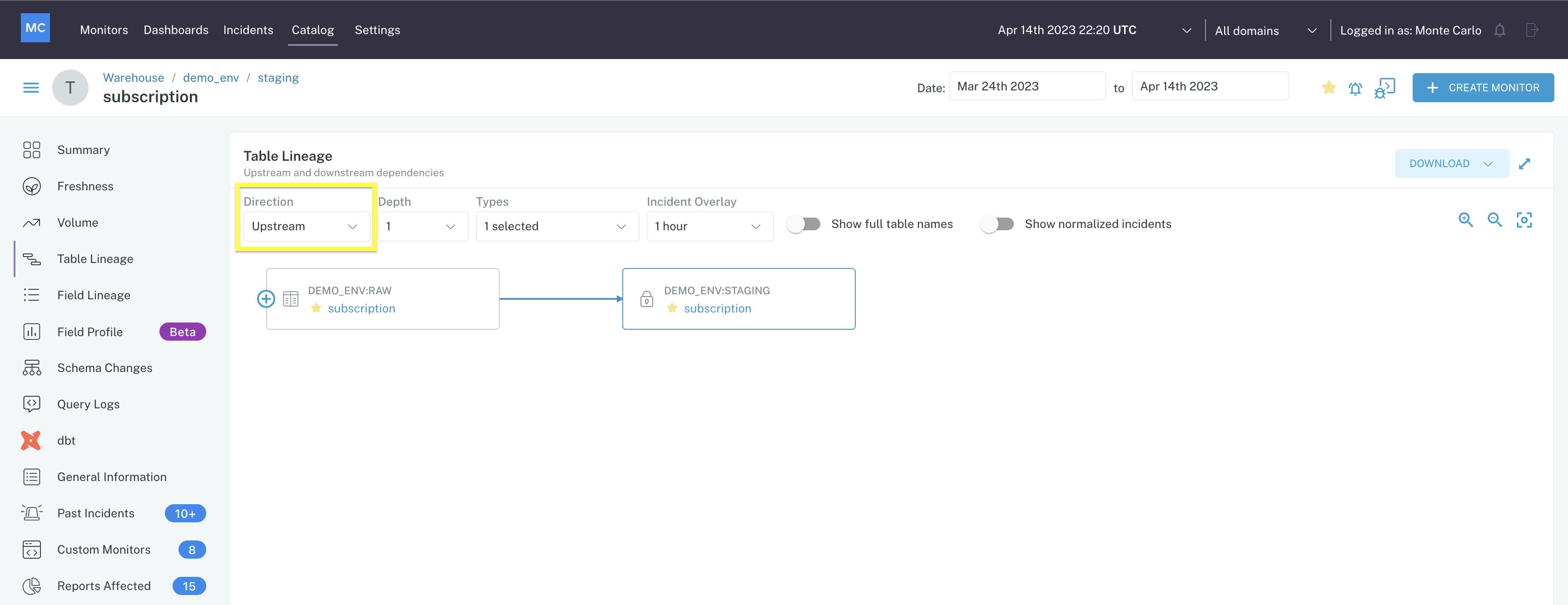 Monte Carlo’s Assets module provides users with a management console to view all of the data assets that are connected to Monte Carlo. For each data asset users can view summary pages populated with metadata. Possible metadata includes table lineage, field lineage, query logs, freshness, and volume. Each asset also shows the normal patterns for a particular table. One example is the ability to map table lineage for each data asset, demonstrating how data is flowing into a data asset and where the data flows downstream.