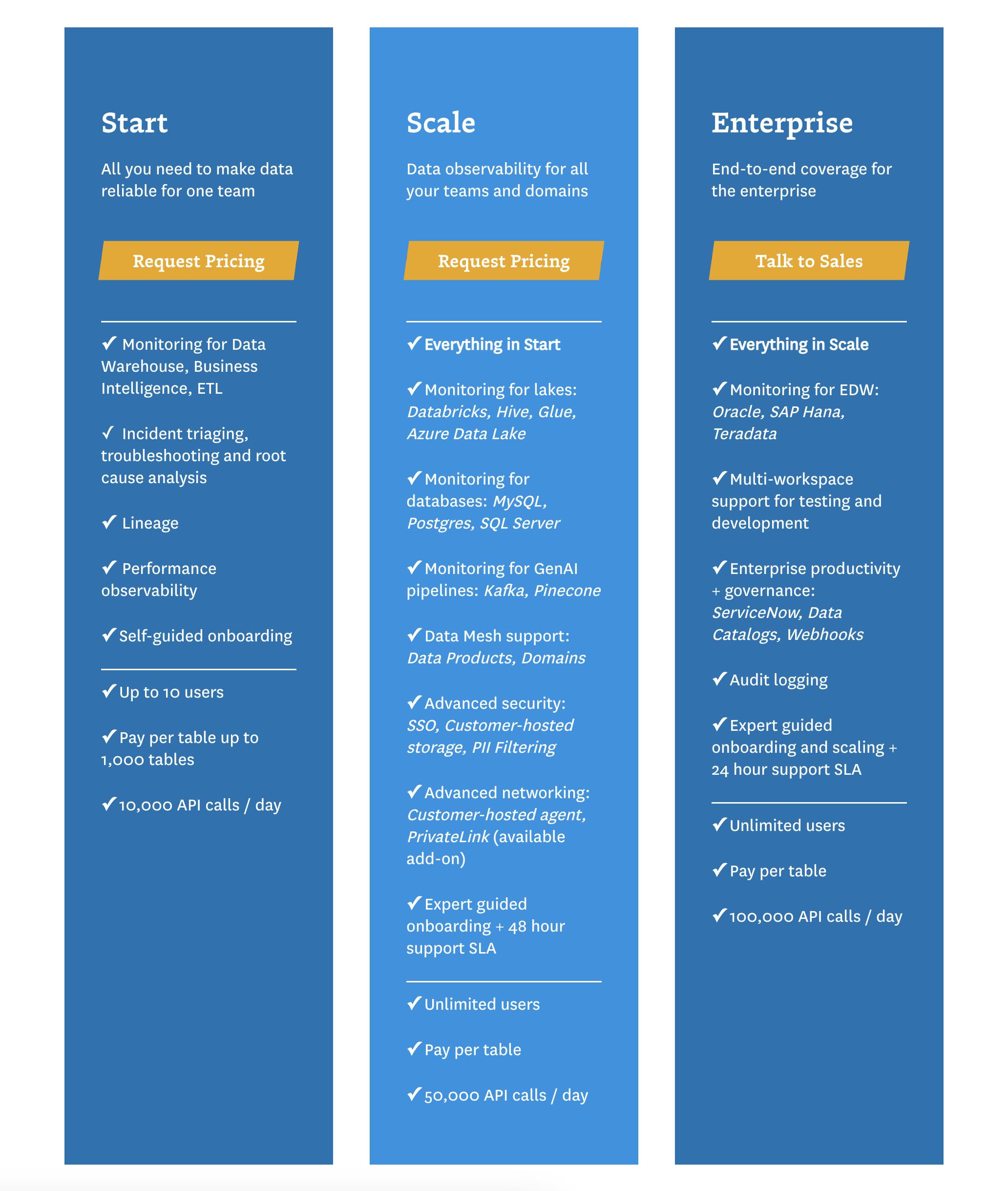 Monte Carlo offers a pay-as-you-go SaaS model where customers are charged based on how many tables and data resources they monitor. It offers three tiers for small, medium, and enterprise companies, with an increasing number of users and API calls per day. It promises a plug-and-play experience for users to get value on the platform out of the box. Notably, it lacks a freemium model employed by other competitors. Monte Carlo also provides a data quality calculator for prospective users to measure the value of data quality and quantify the data engineering time saved with its service.
