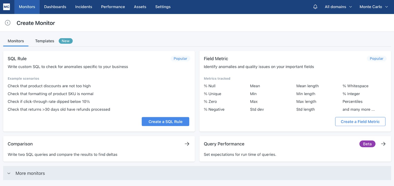 Monte Carlo offers a variety of monitors for data teams to observe the data pipeline. Teams can instantly deploy monitors based on specific metadata. They can also strategically deploy a deep quality monitor on important tables. For this case, ML models train on historical data to enhance the static thresholds that would be traditionally set by data teams. Teams can set custom models that use custom SQL queries to asses for business-specific anomalies and establish important metrics.