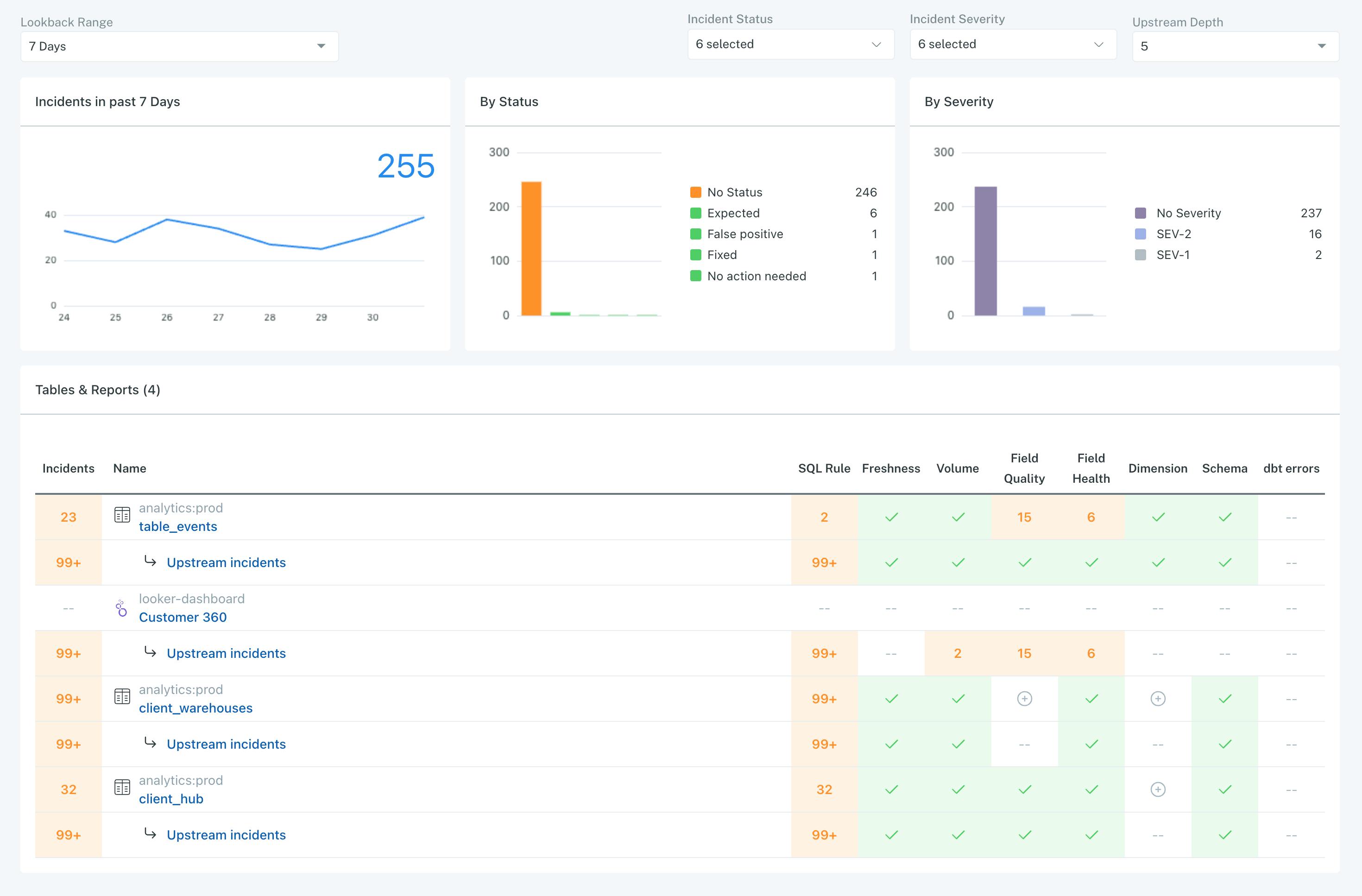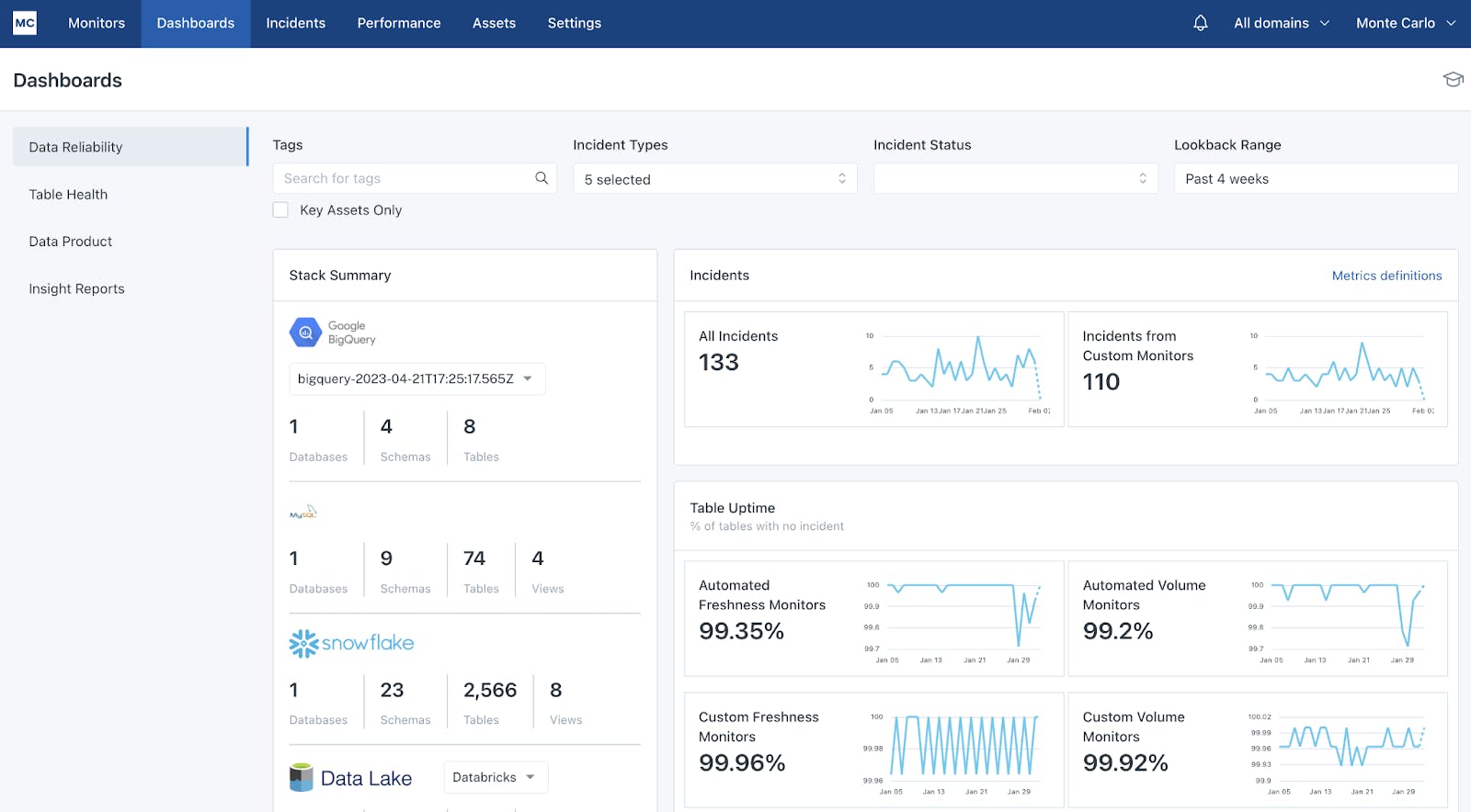 Data Reliability Dashboard: This dashboard displays a high-level view of a customer’s data ecosystem. It reports on the number of incidents and tracks the frequency and time to resolution it takes for teams to respond to alerts.