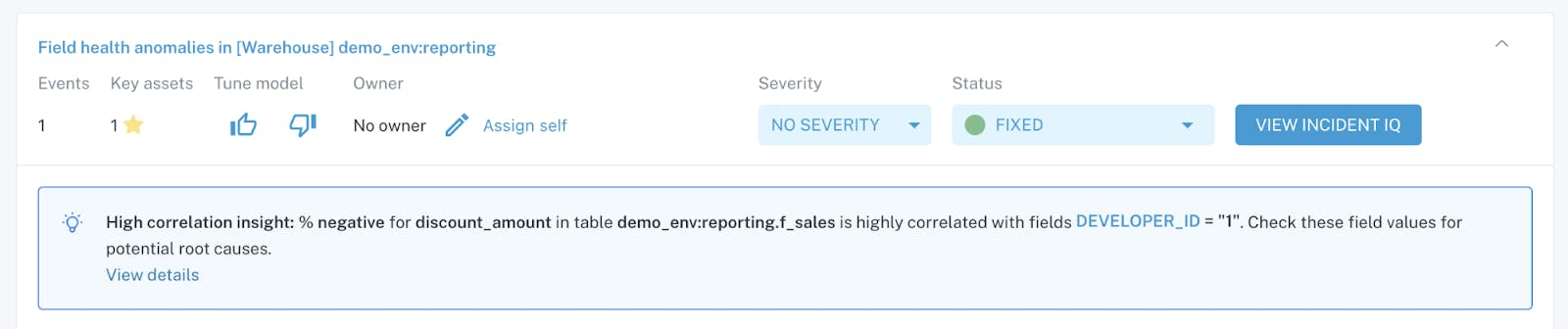 For each alert, the summary tab informs the user of the issue and its impact and serves as the starting point for root cause analysis. It allows the user to see which data assets are affected by the data anomaly, queries that could have caused the anomaly, and BI reports that are at risk from the alert.