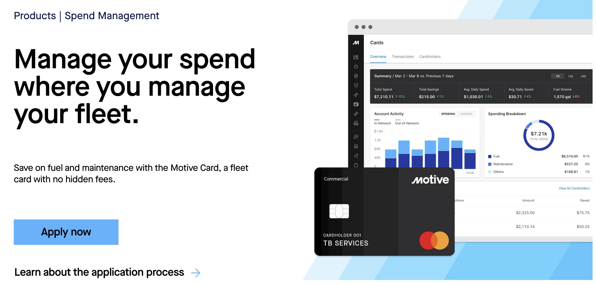 Motive's spend management product helps fleet managers control and optimize expenses associated with their operations. It provides tools for monitoring fuel consumption, analyzing fuel efficiency, and identifying potential cost-saving opportunities. The Motive card also enables truckers to secure discounts and rewards on fuel, maintenance, and other trucking-related expenses. Fleet managers can also set spending limits for each cardholder by day and time, transaction, and product category.