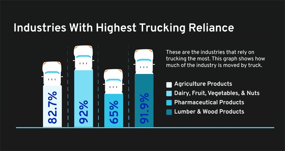 Industries with a high dependence on trucking — like agriculture, pharmaceuticals, and lumber — represent another key market. The percentage of goods transported by truck in these industries ranges from 65% to 92%.