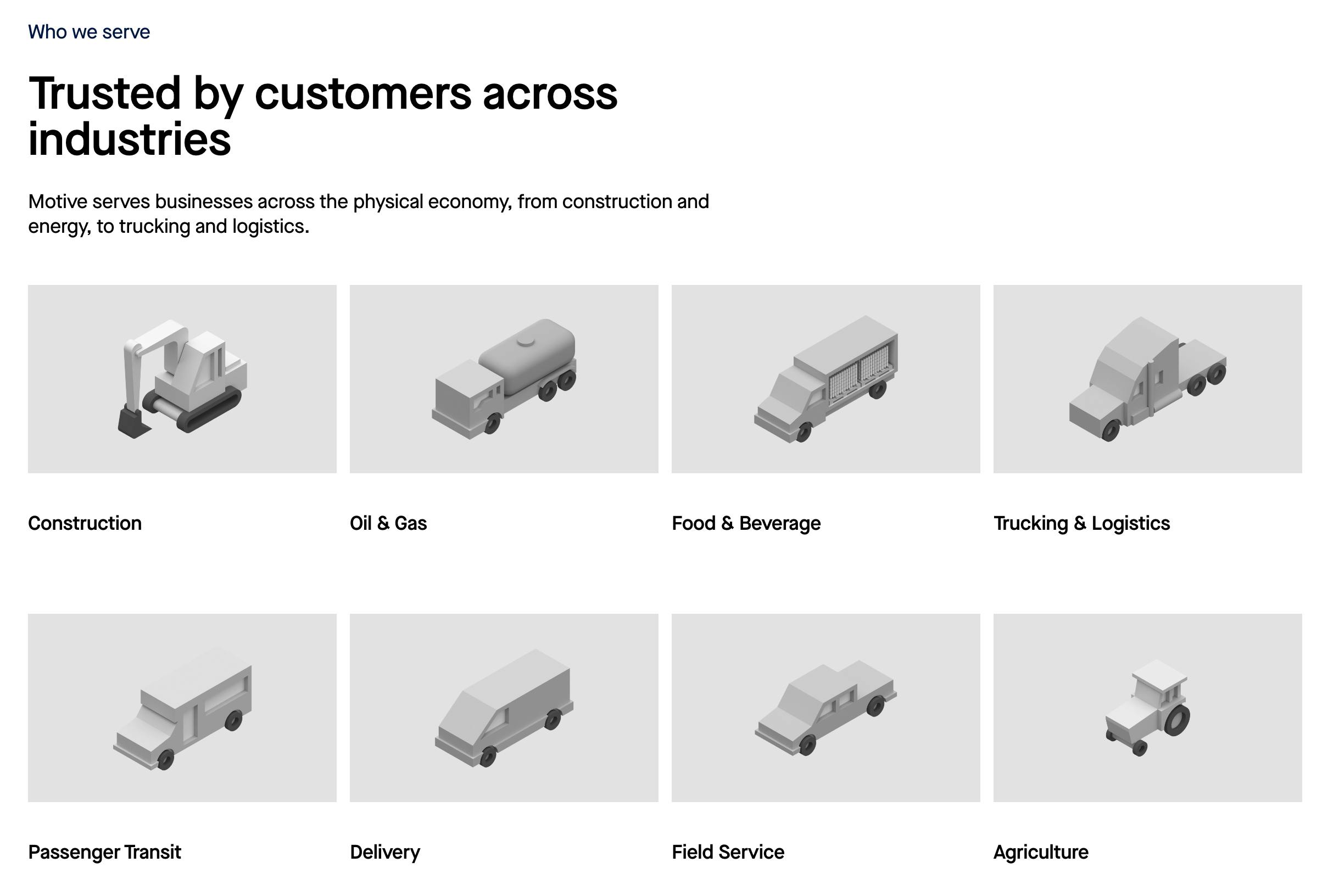 While Motive's primary customers are in the trucking industry, it also serves a wide array of sectors that involve logistics and fleet management, from construction and transit to resources and agriculture.