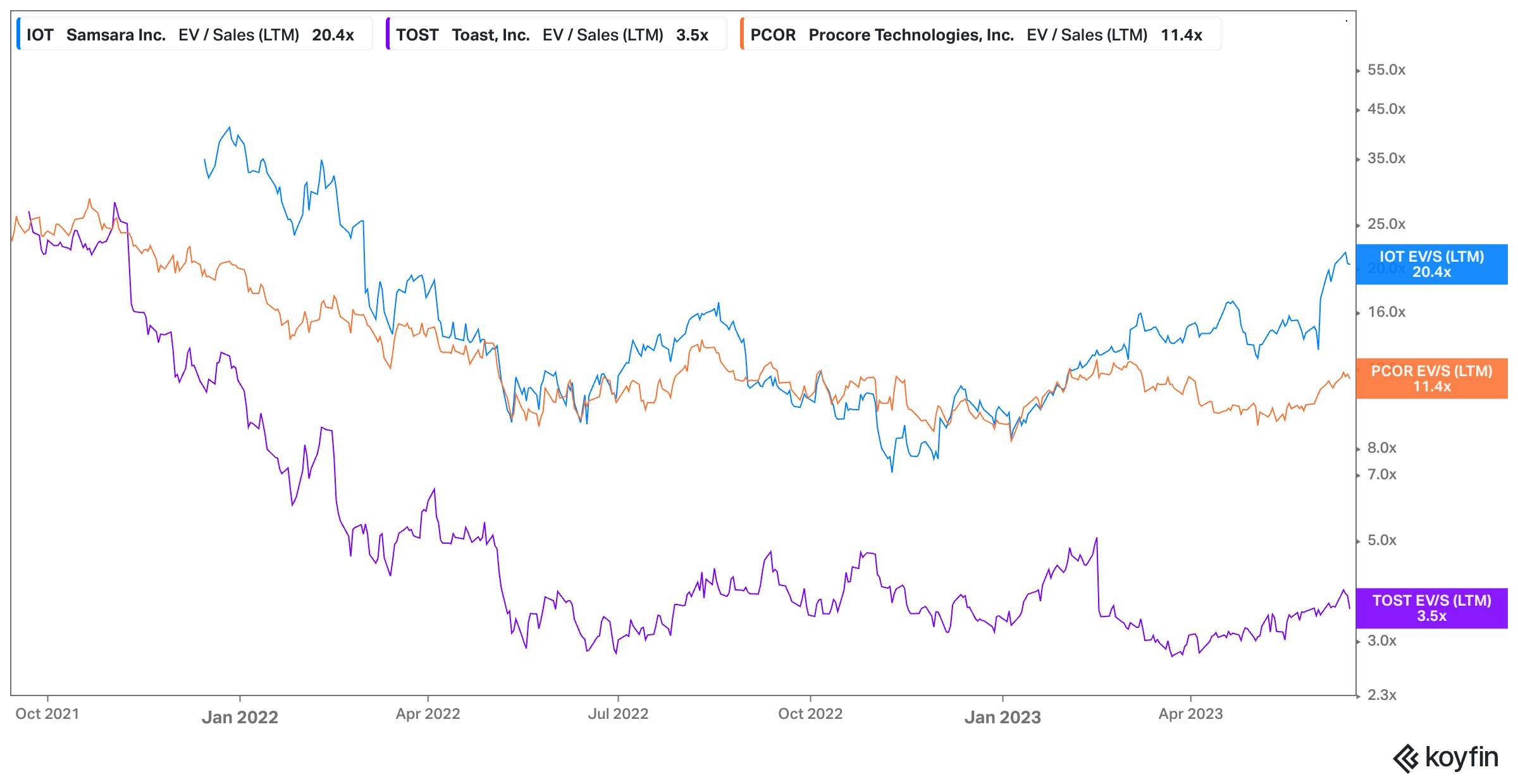 In 2021, Motive was reported to have annual recurring revenue of $150 million. Comparable vertical SaaS companies trade anywhere from a 3.5x to 20.4x revenue multiple. Samsara, the publicly traded company that most closely resembles Motive, trades at a 20.4x revenue multiple, and this multiple has been as high as ~45.0x and as low as ~7.0x from the time of Samsara’s IPO in December 2021 until June 2023.