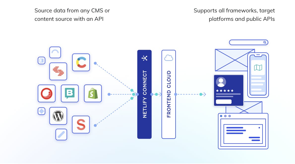 Connect includes no-code integrations for a selection of supported content sources, an SDK that allows users to integrate custom content sources more easily, API calls that route content directly to where data is cached, the ability to automatically rewrite all frontend updates and content changes to the originating content source, and the ability to create webhooks for custom or non-Netlify websites.