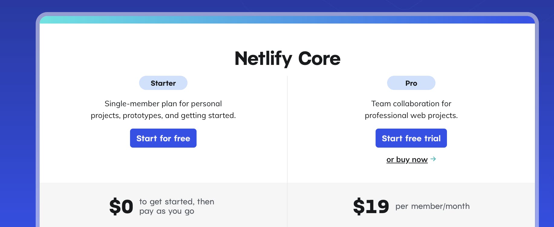 Netlify has a SaaS business model with three different pricing tiers. The “Starter” tier is a plan for individual developers to create personal projects and is free. The “Pro” plan is a tier meant for small teams to collaborate and create web projects, and it is priced at $19 per member per month. Finally, there is an enterprise pricing tier for which Netlify offers custom pricing.