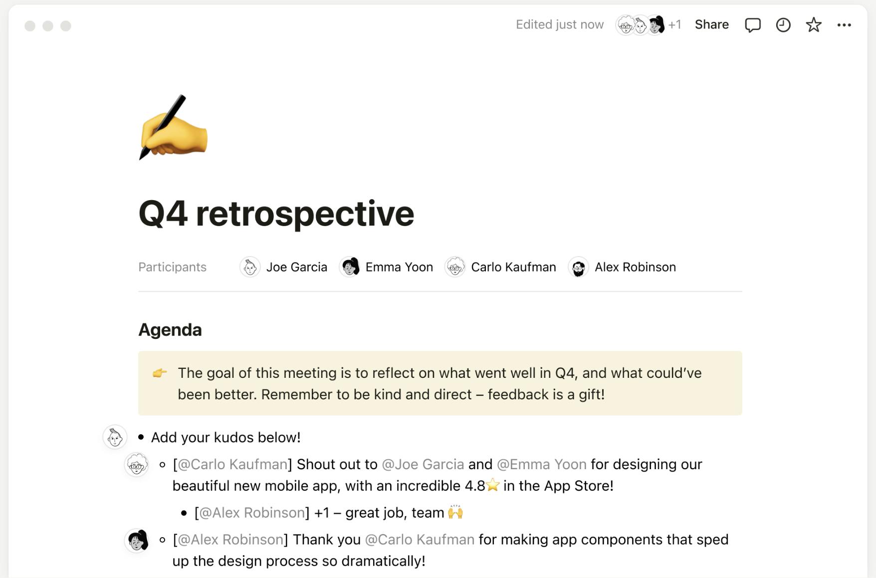 Notion docs are designed to be collaborative with a sharing link function, comments, version histories, and more. Additional functions include adding databases in-line, media (images, videos, audio, files, code, and web bookmarks), and embeds (e.g., Google Drive, Tweet, Typeform, Loom, Figma, and Github Gist).