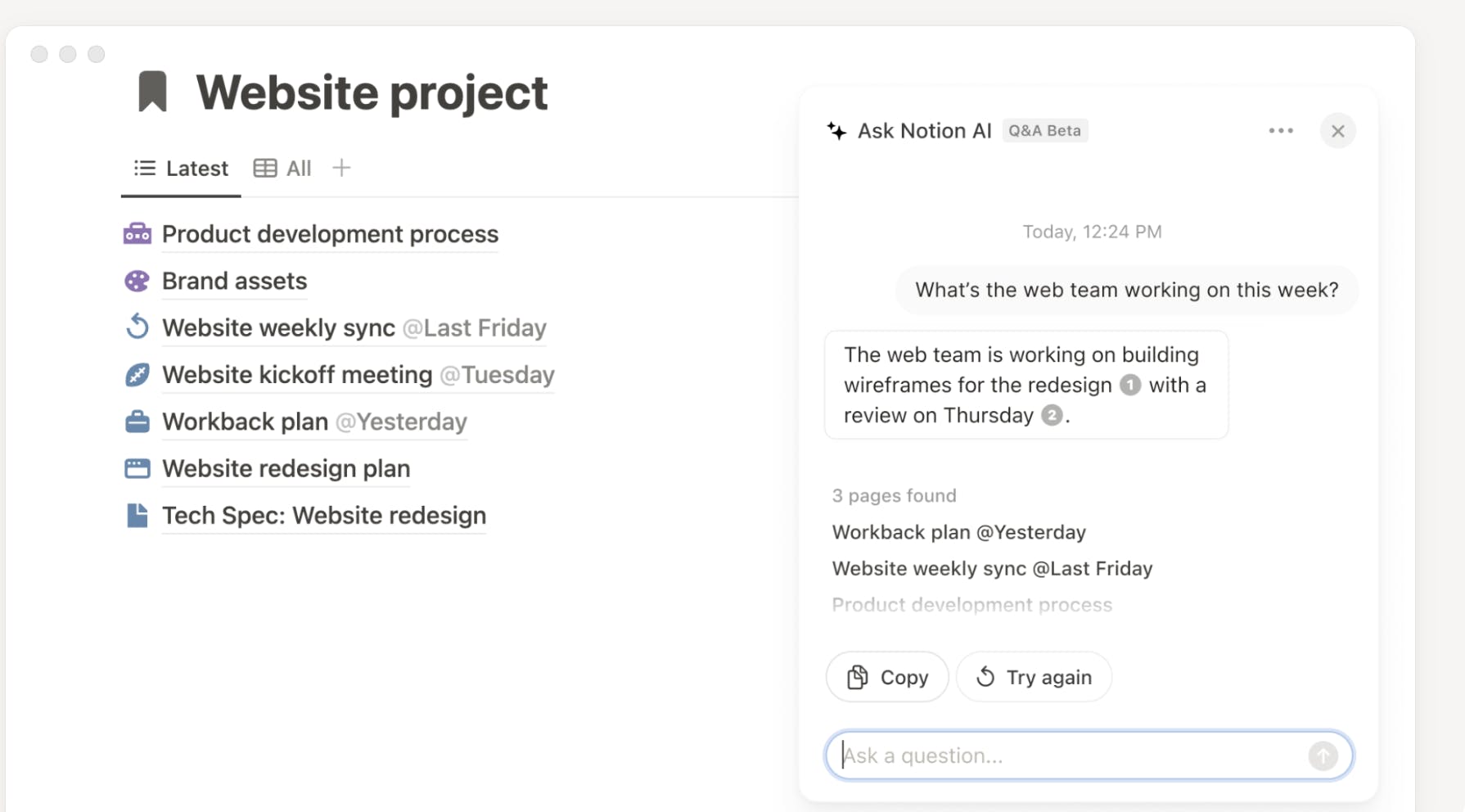 Notion’s Q&A chat tool allows users to make better use of information and data across their workspaces by allowing users to submit natural language queries. To answer these queries, Notion AI pulls the relevant information and presents it with cited references to the Notion docs that the information was sourced from.