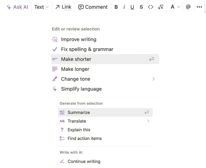 Notion’s integrated writing assistant can be accessed by selecting any text within a Notion document and choosing “Ask AI” on the far left side of the menu. This brings up a dropdown menu with a variety of options. The writing assistant can summarize or interpret a selection of text or use the selection as seed data to generate an additional passage.