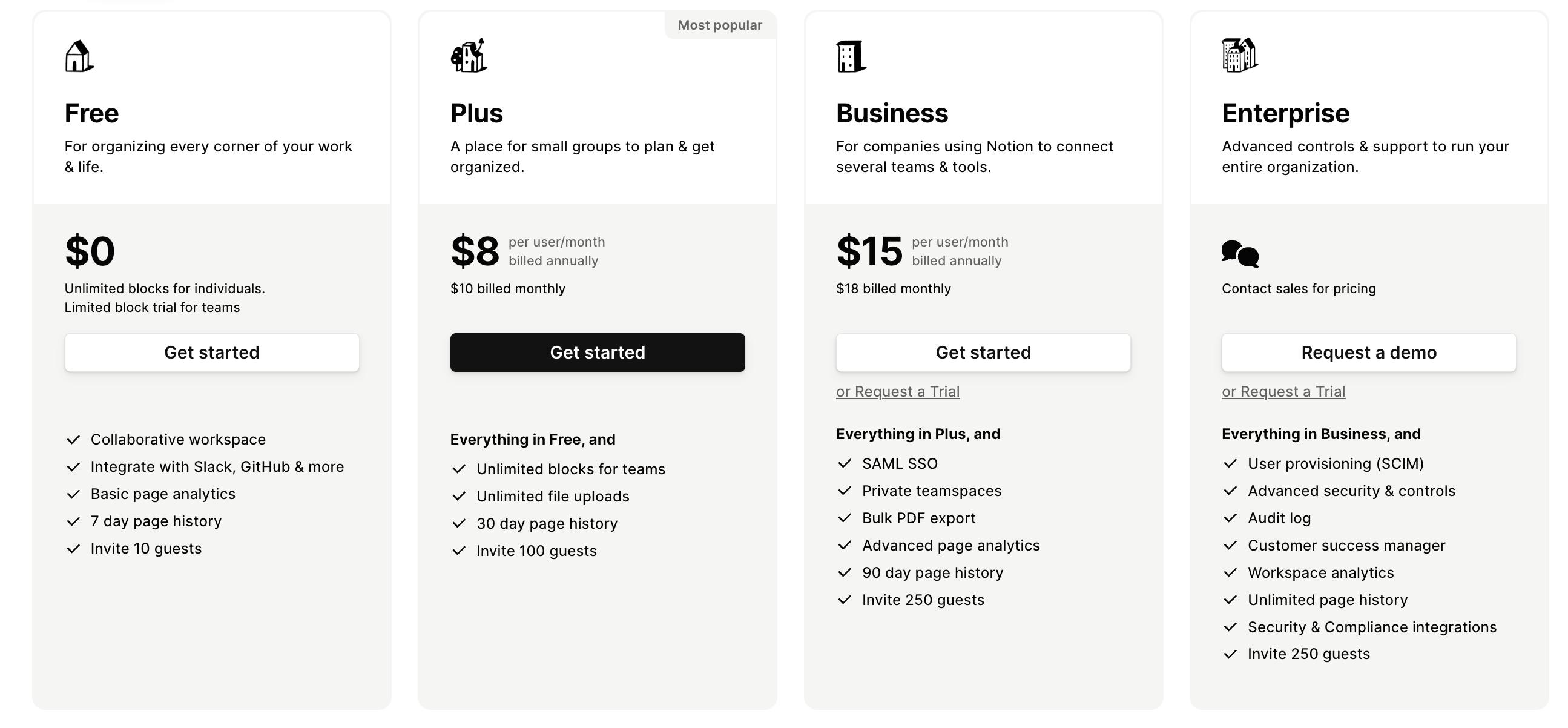 Notion has a SaaS business model and offers four pricing tiers for its subscriptions: