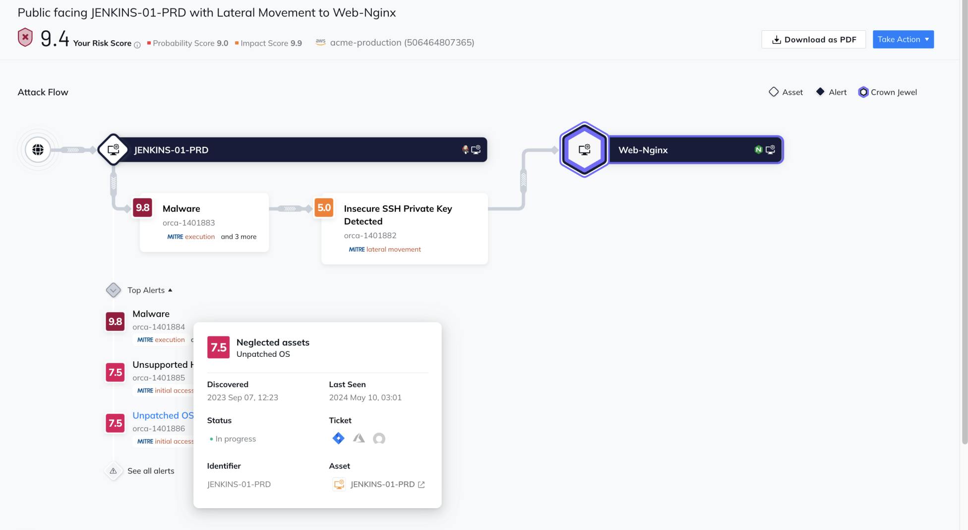Orca Security’s Attack Path Analysis system connects vulnerability risks to each other and their impact on the business. A risk score indicates the probability and impact of the attack while the main interface shows how different vulnerabilities combine to form exploitable attack paths.