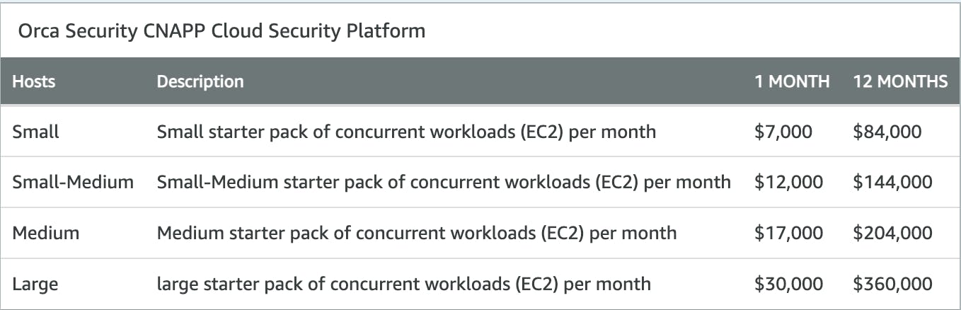 The initial offering is a starter pack equipped with concurrent workloads for parallel execution (EC2). This gives businesses a broad package experience with the flexibility to scale workloads as their organization grows. Prices range from $7K to $30K per month, with pricing compared to companies like AWS, which charge a $5K monthly bill for SMEs. Orca Security sells its products at a premium, positioning itself as an all-in-one, proprietary solution for companies. In doing so, its pricing model focuses on the largest enterprise customers. This serves two purposes: (1) it extends its profit margins by selling to companies with higher volumes of data, and (2) it maximizes external perceptions of superior quality, exclusivity, and impact.