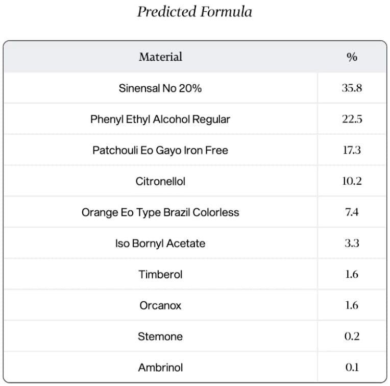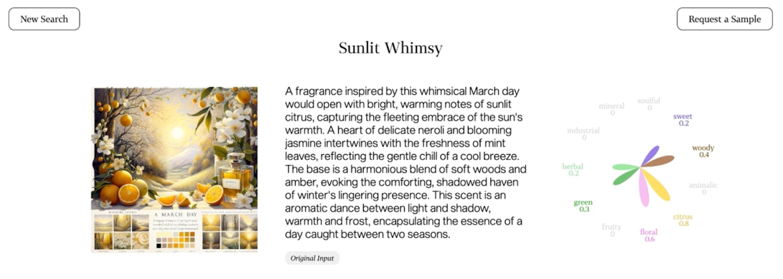 For clients, the process begins with a creative brief, via text, image, or audio, describing the intended narrative or emotional arc of the fragrance. Osmo’s OI system parses this input, interprets the semantics, and generates an initial fragrance formulation. This is then refined through additional suggestions/alterations from the client with the assistance of master perfumer, Laudamiel, followed by the synthesis and delivery of a physical sample. The iterative process is therefore cut down from ~3 months to only days/weeks.