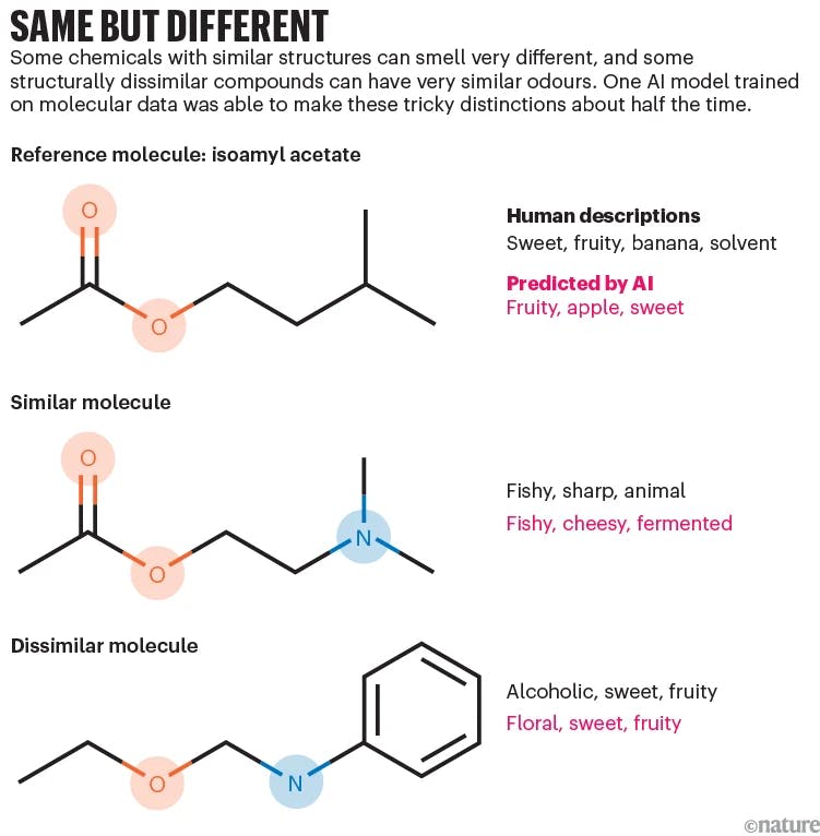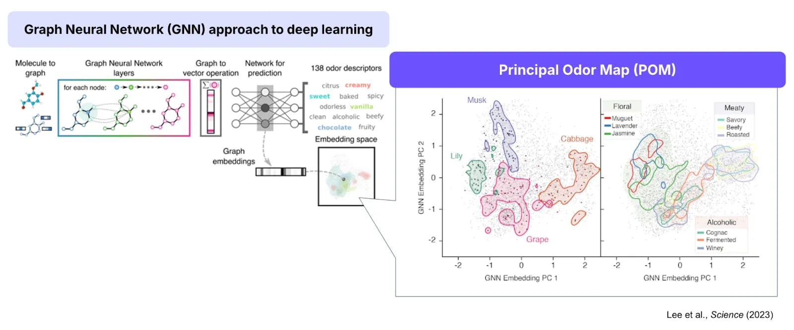 The success of GNNs in modelling chemical relations when compared to other deep learning methods is attributable to this encoding stage. The graph is then aggregated via a summation or average operator to all nodal vectors into a single learned embedding forming the POM, offering semantic generalisation for Osmo to project even unseen molecules into the space and predict the olfactory profiles. Additionally, user feedback, such as “too citrusy” or “not woody enough”, has been helping model tuning, equivalent to RLHF.