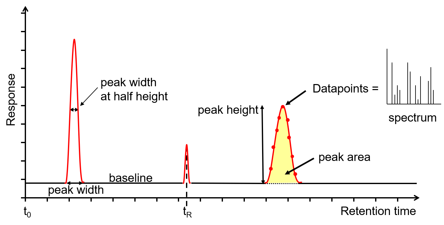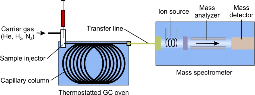 In the gas chromatography (molecule separation) stage, the mixture is vaporised and combined with an inert carrier gas, typically helium, referred to as the mobile phase, which passes through a coiled column lined with an absorbent liquid, referred to as the stationary phase. Each compound travels through the column at a rate determined by its boiling point, molecular weight, and affinity for the stationary phase, resulting in the separation of the mixture’s constituents. The output is a chromatograph with distinct peaks, each representing an isolated molecule.