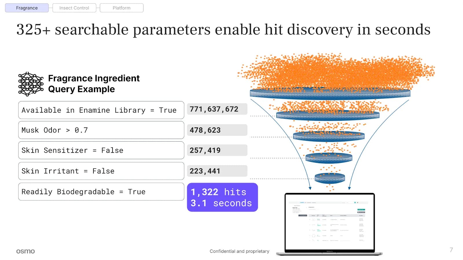 These capabilities are supported by Osmo’s expanding virtual molecule library, containing over 1 billion small molecules. This database enables rapid querying of potential ingredients for scent design, allowing users to identify candidate compounds that meet safety, regulatory, and perceptual criteria before physical synthesis or testing. This interface bridges the molecular analytics with creative formulation.