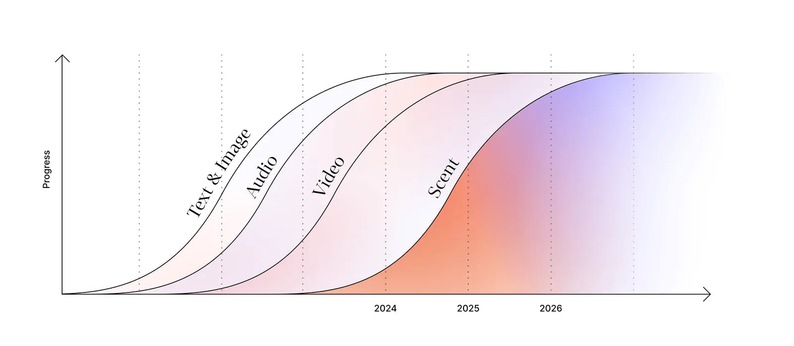 With vision, we understood the visual cortex and therefore biology before making any inspired technology. However, with audio, we developed mathematical models prior to understanding the biological elements. The method of digitizing scent is parallel to that of audio, in which it is developing AI models to replicate olfaction, with a tech-first, biology-second approach. This approach has been a necessity since it is still not understood fundamentally the interaction/binding between the molecules and the 400 unique receptors, the shape of the receptors, or the encoding of these complex signals to the brain.