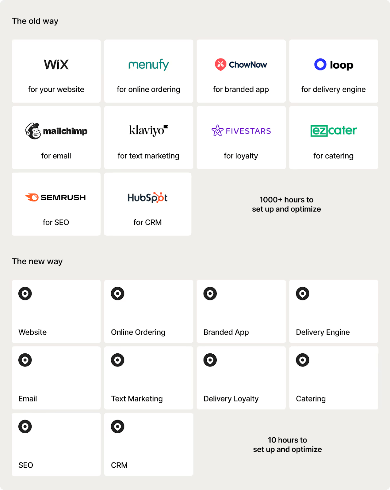 Independent restaurant operators, however, face structural disadvantages. Unlike the large chains, they don’t have the budgets to invest in building out their own technology and rely heavily on third-party marketplaces. For delivery, independent operators often pay high commission rates to platforms like DoorDash and Uber Eats, which also keep control of the customer relationship. To manage everything else, independent operators often rely on a variety of separate software systems to handle their website, CRM, marketing, app, menu, and more. Building the type of brand loyalty these tools enable is one reason why chain restaurants have been so successful, with the top 500 restaurant chains accounting for over 60% of all US restaurant sales in 2024.