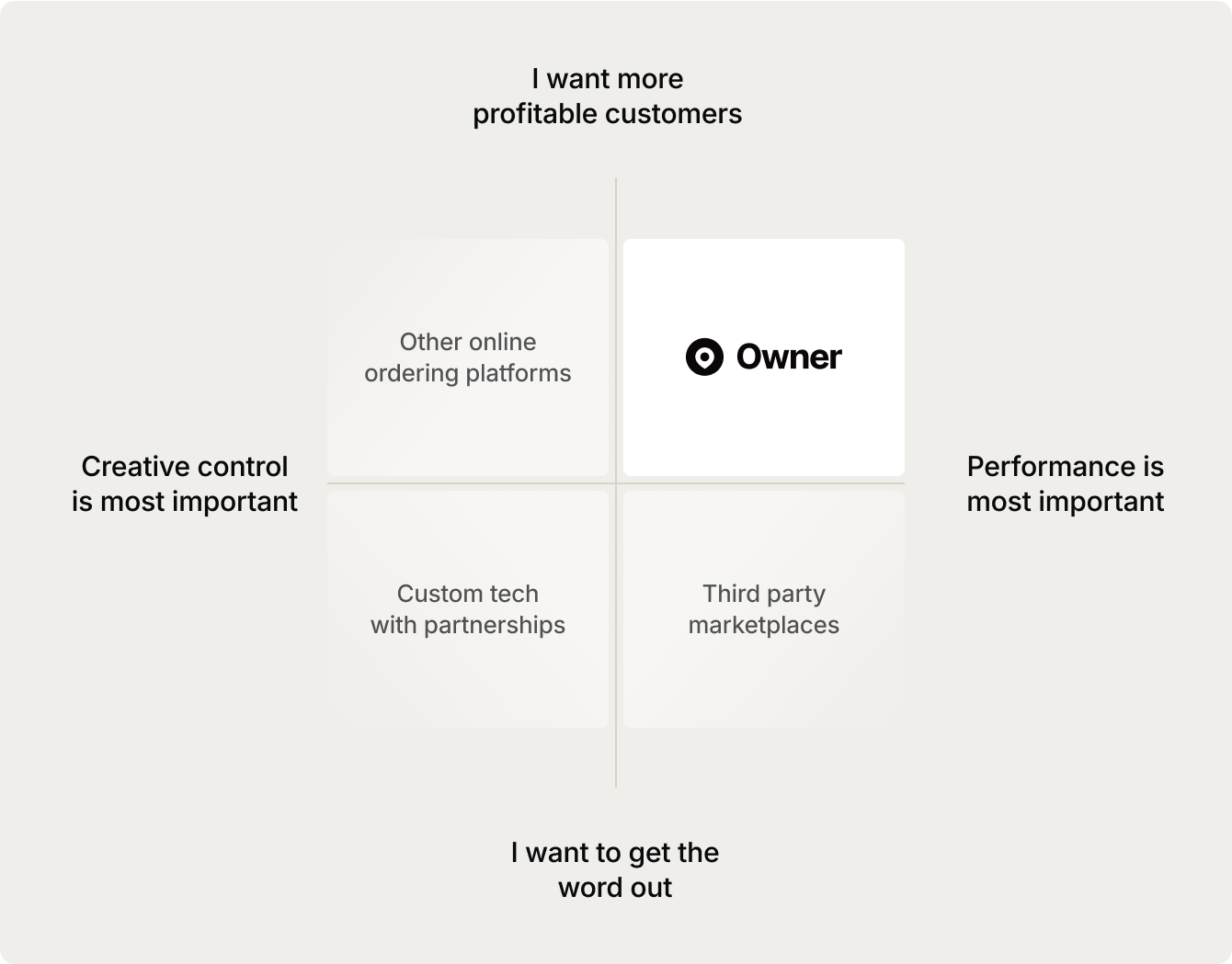 Owner’s customers are independent restaurant owners, typically operators of single-location or small-chain eateries that lack the resources of national brands. Their pain points are often low online visibility, high fees on delivery orders, low repeat order rates, and no unified way to manage it all.