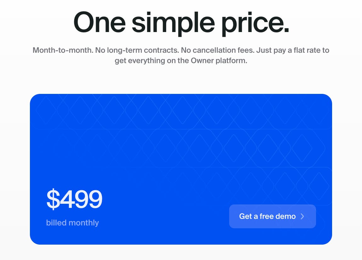 Owner sells its platform on a SaaS model where restaurants pay a flat $499 per month per restaurant for the full feature set, with no contracts, tiers, or feature-based upsells. The lack of any tiers or pricing options sets it apart from its competitors. For example, ChowNow offers three tiers, Bentobox offers five options and a “build your own” plan, and Popmenu offers three tiers. Owner also exclusively does month-to-month pricing, not annual contracts, and says it believes in “earning [customers’] business every month.”