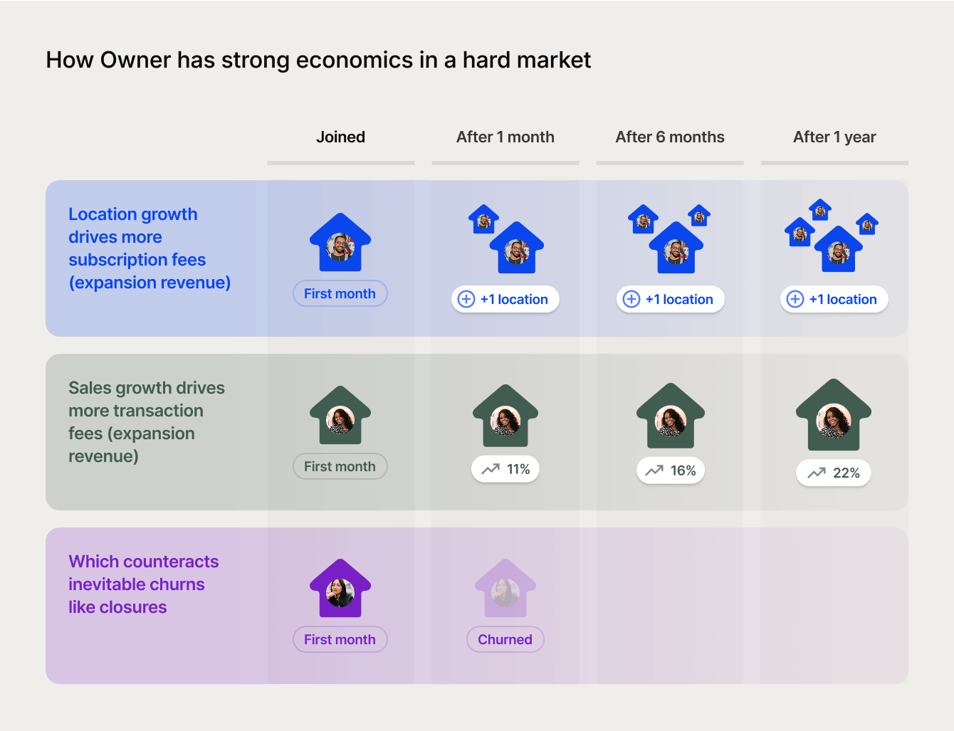 Owner charges a flat rate to customers for its software per location, but its goal is to grow its overall revenue per customer over time. Because Owner charges per location and per order, it makes more money as its customers add locations and grow their online business.