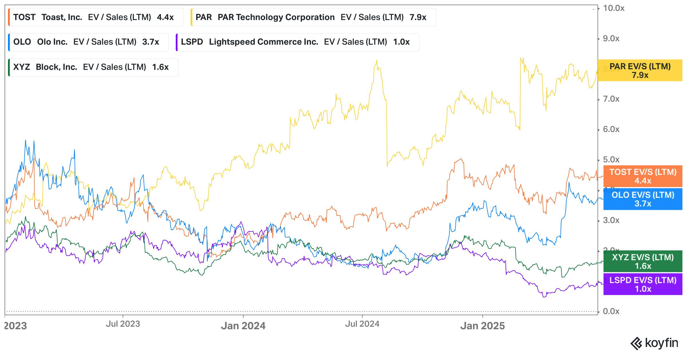 In terms of publicly traded companies that provide technology for restaurants, they trade at a range of EV / LTM revenue from 1-7.9x as of June 2025. These companies differ in notable ways where Block and Lightspeed serve the broader retail market in addition to restaurants, whereas Toast and Olo are focused on restaurants.