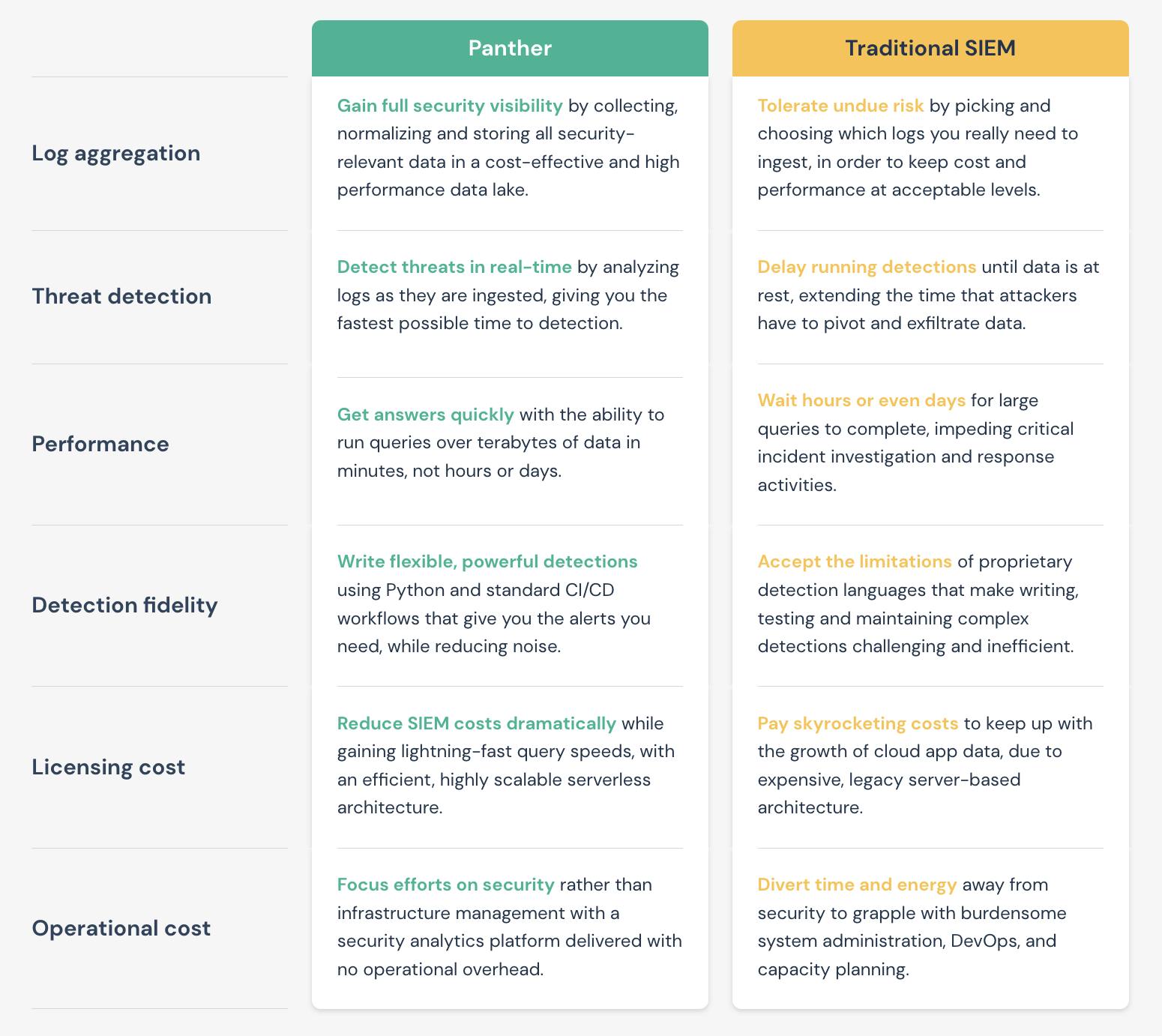 Competition is fierce in the SIEM market. Most vendors are differentiated by specific use cases (cloud vs. on-premise, data volumes, and specific workloads). Panther’s focus is primarily on cloud-native organizations with leaner teams looking to adopt best practices in managing their unstructured security data. While Panther is cost-effective in terms of resources and management costs, it is likely not as strong a fit for larger organizations with hybrid or on-premise environments.