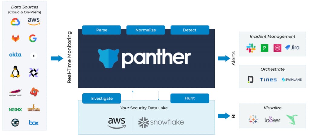 Panther performs most of this analysis through a core tool built for SOC teams. The underlying foundation of Panther’s product is built around serverless architecture and cloud data storage. Panther has an open security data lake architecture built around Snowflake that decouples compute from storage. This allows organizations to manage and retain large amounts of data for much longer. Companies can also perform highly performant analyses of data. Panther is built to be developer-friendly with a quick start open-source guideline so customers can get started easily.