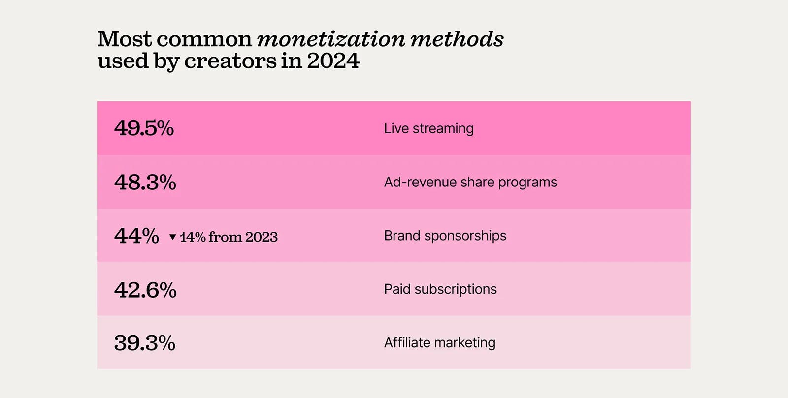 As of 2024, over half of creators who had monetized their content were working full-time, with most feeling fairly compensated. YouTube was their primary income source, followed by TikTok and Facebook. Key revenue streams include live streaming, ad-revenue sharing, and brand sponsorships, with paid subscriptions through platforms like Patreon also contributing. As of May 2024, more than 80% of creators were investing in digital marketing and analytics skills to advance their careers, reflecting a growing view of content creation as a business. However, with wealth and audience reach still concentrated among top creators, just 4% of creators earned $100K or more annually as of 2024.