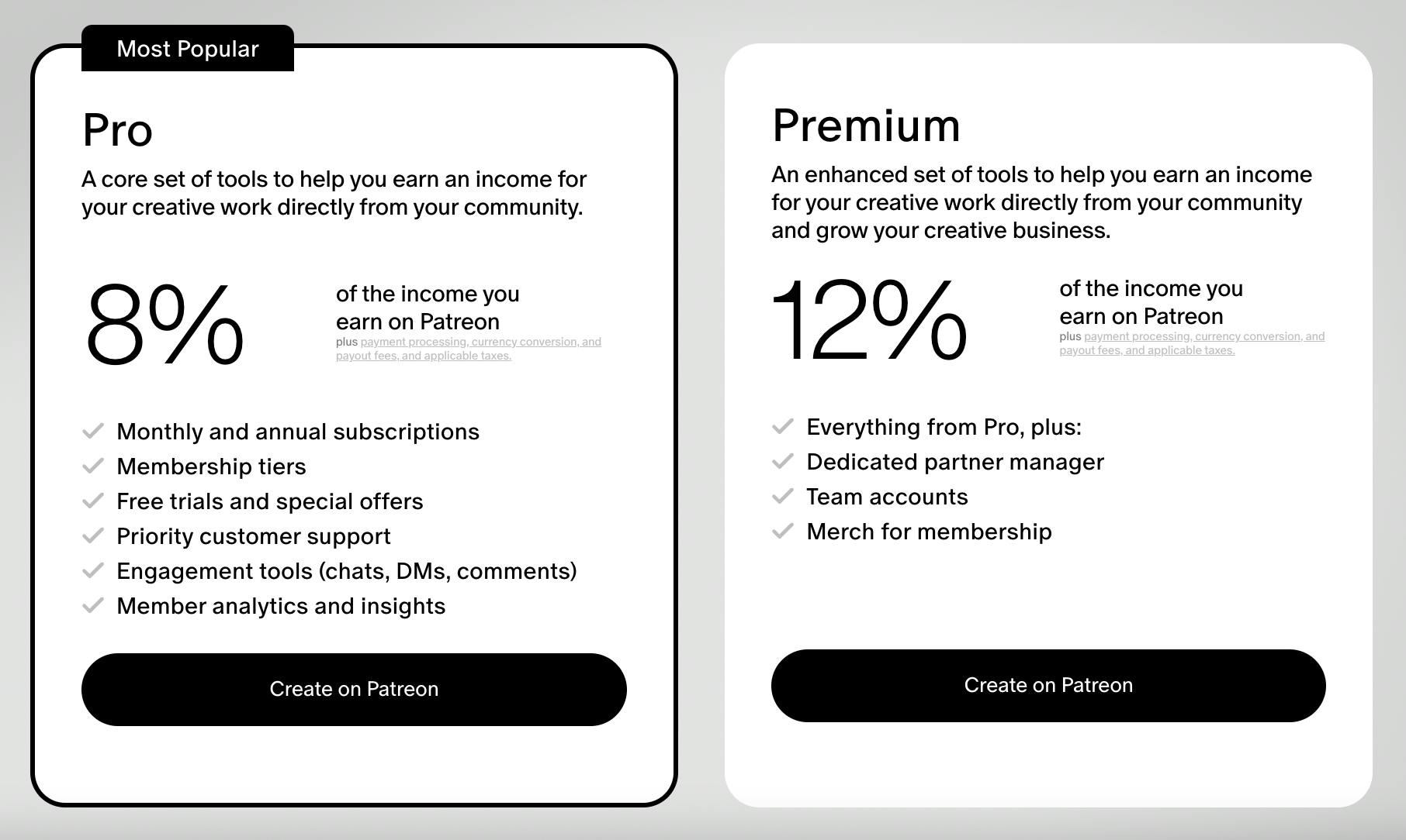 Patreon operates a commission-based business model with two main plans, catering to the needs of creators at different levels of their careers. The Pro plan, with an 8% fee of income earned on Patreon, offers tools and features for creators aiming to grow and engage their audience more effectively. For creators on the Pro plan, the payment processing fee is 2.9% + $0.30 per payment over $3. The Premium plan, with a 12% fee of income earned on Patreon, is tailored for established creators requiring advanced features and personalized support to manage and scale their operations. For creators on the Premium plan, the payment processing fee is 5% + $0.10 per payment under $3.