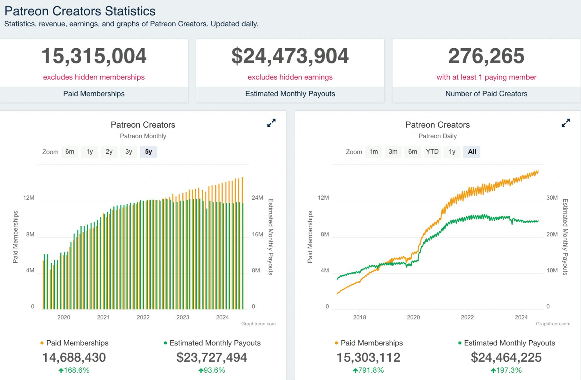 Graphtreon uses publicly available data from Patreon to estimate the total monthly payouts on the platform. While some creators elect not to make their monthly earnings public, who are therefore excluded from this total, the graph indicates a general growth trend, including a spike in the early months of the COVID-19 pandemic and less aggressive growth since 2021.