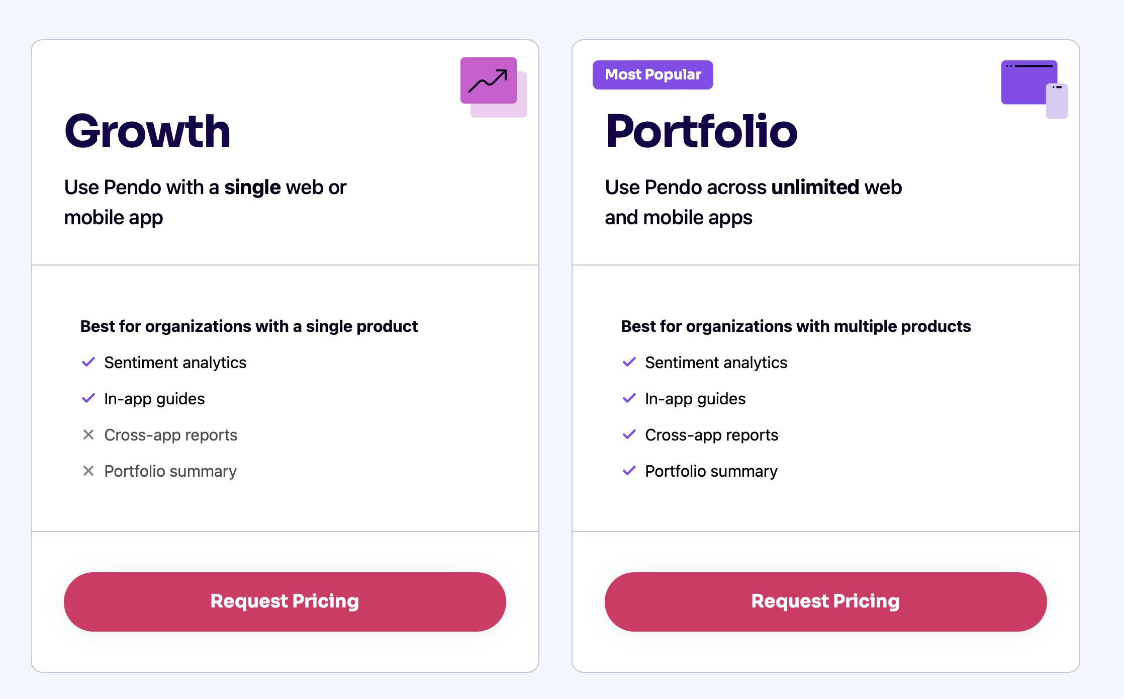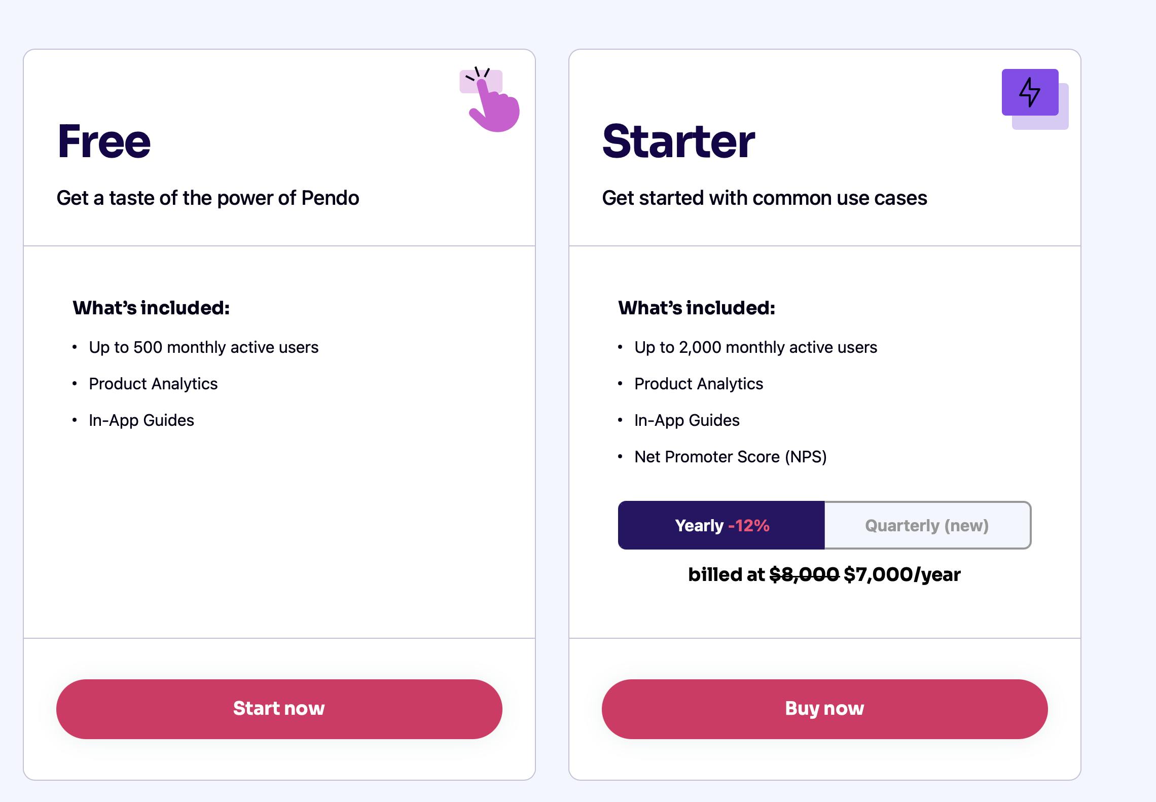 Pendo operates on a freemium model, and pricing varies between its Pendo Engage and Pendo Adopt offerings. The Pendo Engage Free plan includes product analytics and in-app guides for up to 500 monthly users. The Pendo Engage Starter plan includes product analytics, in-app guides, and net promoter score support for up to 2K monthly users, billed at $7K annually.
