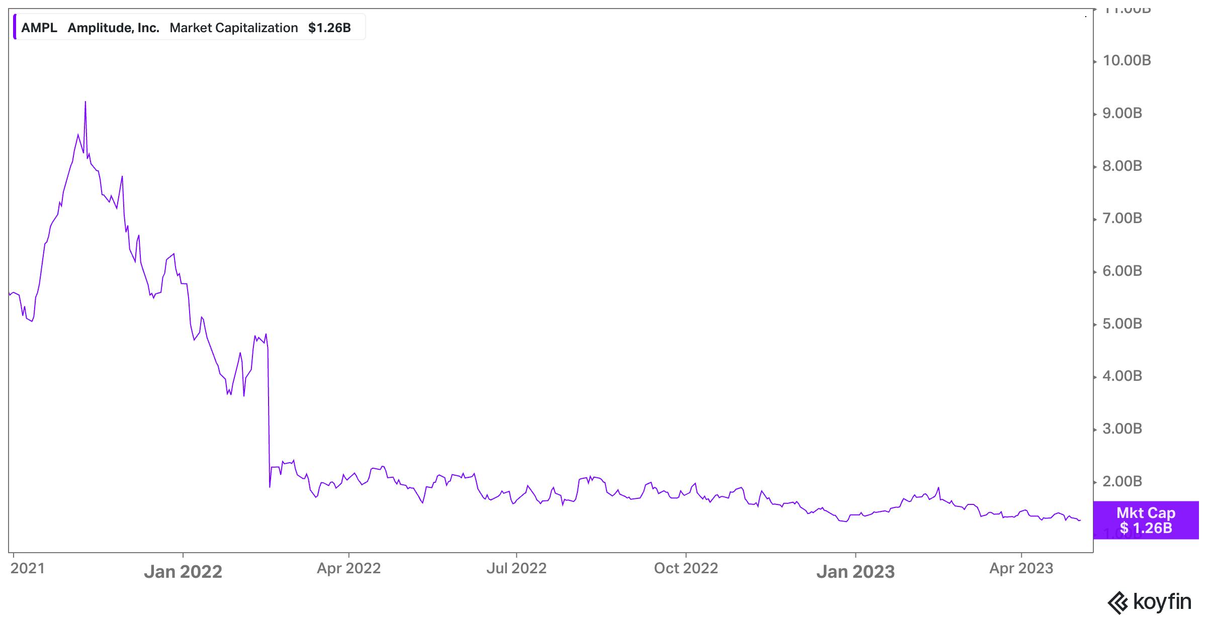 Pendo’s closest competitor, Amplitude, went public in 2021 at a market cap of $5 billion. After peaking in November 2021 at $9.2 billion, as of May 2023 Amplitude’s market cap was $1.3 billion. Prior to IPO, Amplitude raised a Series F at a $4 billion valuation. At a $1.3 billion market cap, that represents a 4.1x LTM revenue multiple.