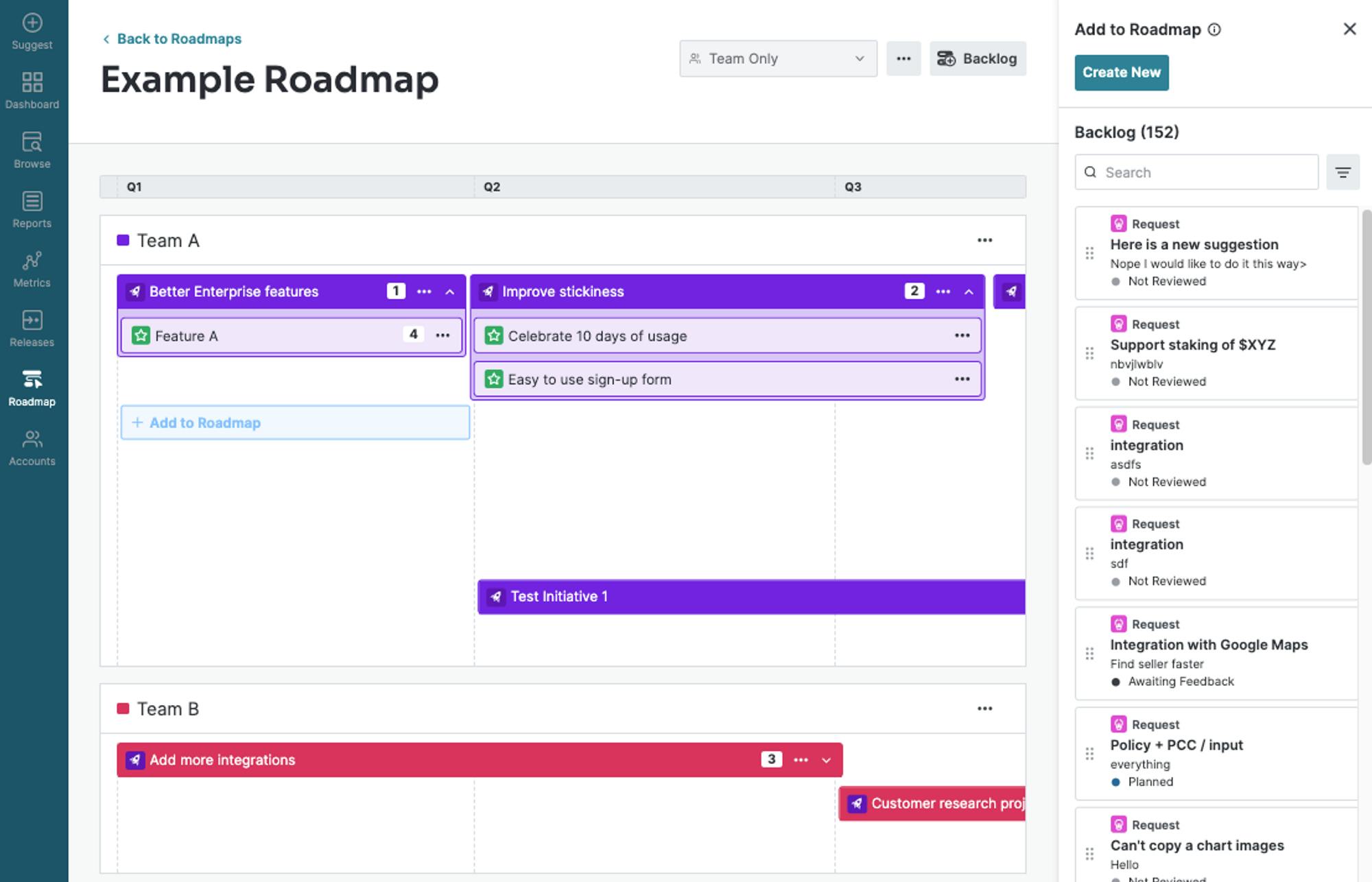This feature allows companies to communicate priorities, align stakeholders, and bring Pendo-collected data into their product roadmaps. Every feature and initiative on the roadmap can be validated and visualized in terms of impact with the analytics collected through Pendo. When initiatives and features are created, they can be linked to specific user feedback requests, total votes, and dollar values.