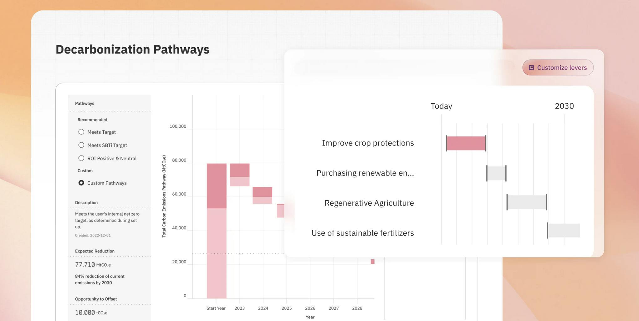 Persefoni’s Net-Zero Navigator helps clients generate industry-specific decarbonization scenarios, goals, and recommendations based on existing emissions data. It features a progress tracker based on objective metrics as well as other reduction targets.