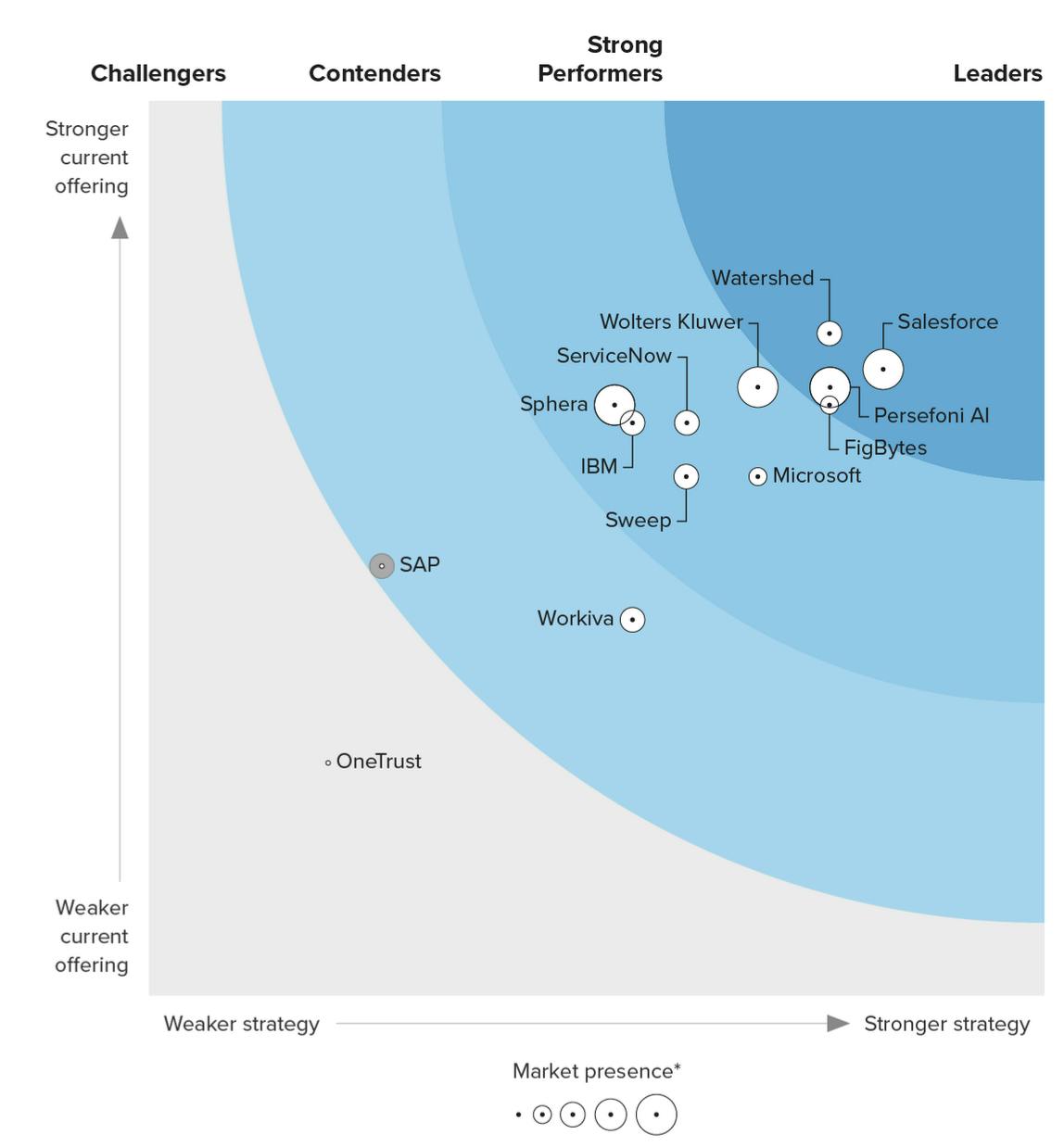 OneTrust: Founded in 2016, OneTrust, is primarily a data governance platform. In Q1 2022, Forrester provided an overview of the sustainability management software market. In that report, it listed OneTrust as having a stronger current offering than Persefoni and only a slightly weaker strategy. OneTrust touted its “ESG solution” as enabling “organizations with environmental, social, and governance technology built into the OneTrust platform. However, by Q2 2024, Forrester had downgraded OneTrust to having both the weakest current offering and weakest strategy in the broader market. In addition, as of September 2024, on OneTrust’s product page didn’t list any ESG or sustainability products.