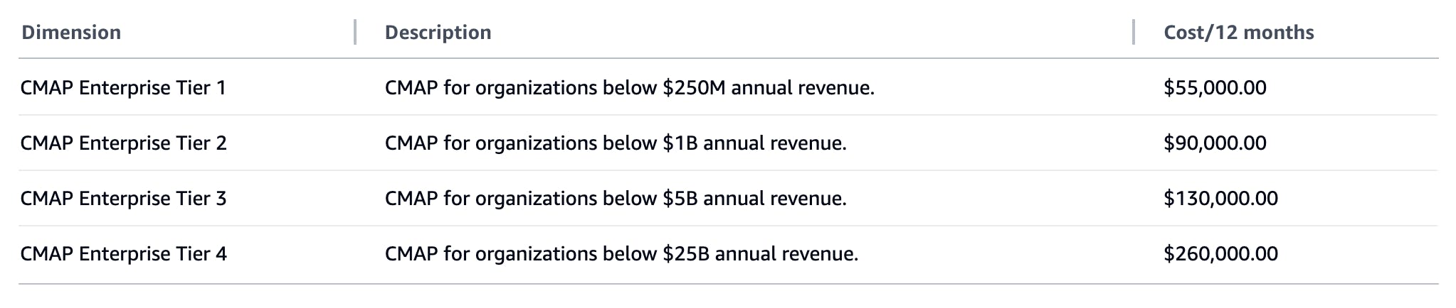 Persefoni is a SaaS business with one-year to multi-year contracts. Pricing for Persefoni’s services depends on customers’ annual revenue, with costs increasing incrementally with organization size. For organizations with annual revenues under $250 million, a 12-month contract costs approximately $55K, while a 36-month contract is priced at $165K. On the higher end, organizations with annual revenues up to $25 billion pay $260K, or $780K for a 36-month contract.