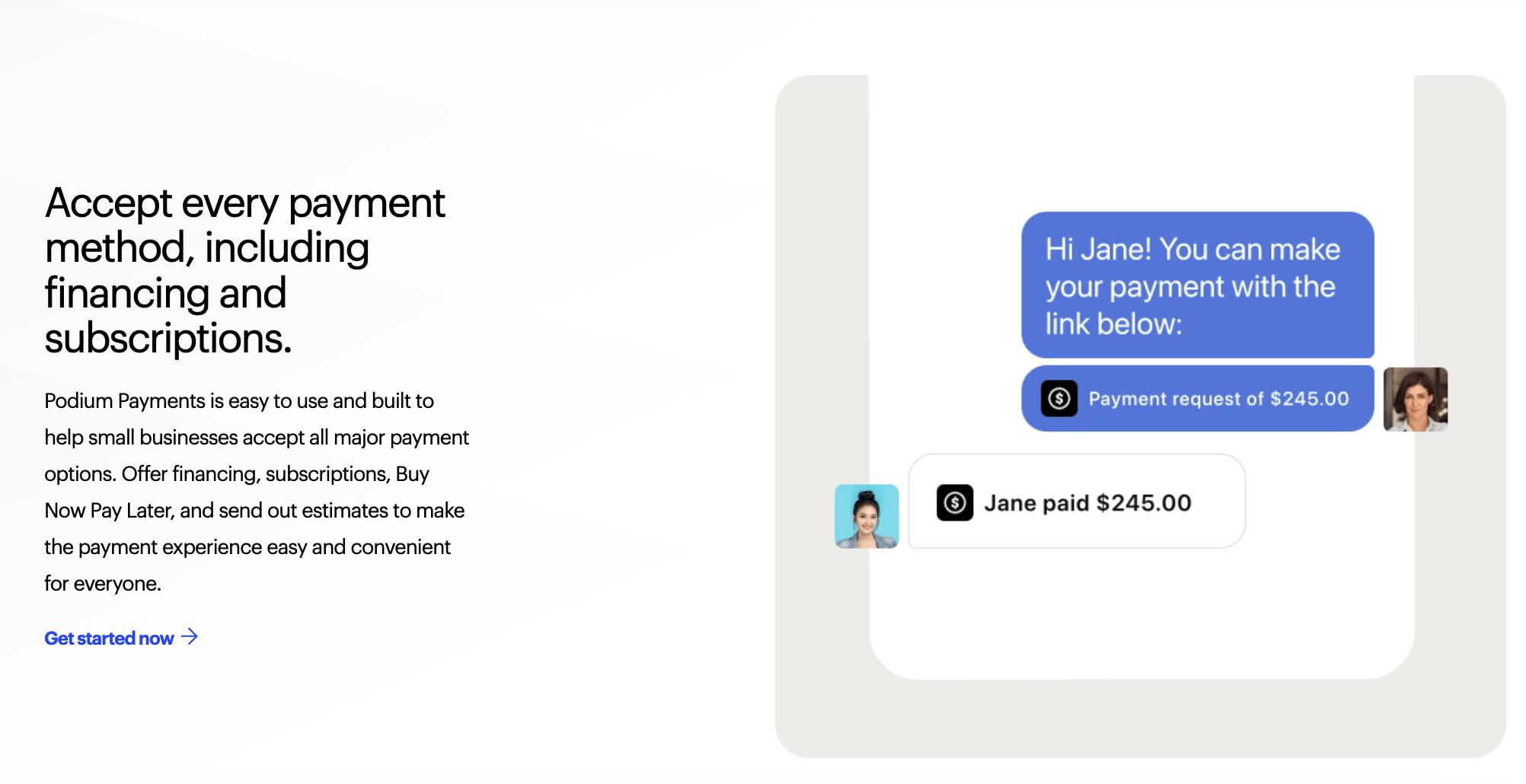 Podium allows users to collect payments from customers with an option to turn phones into physical card readers and the option to text customers payment links. The payments feature can be used to accept all major payment methods, including financing, subscriptions, and BNPL. The feature also comes with fraud protection and automatic reconciliation.