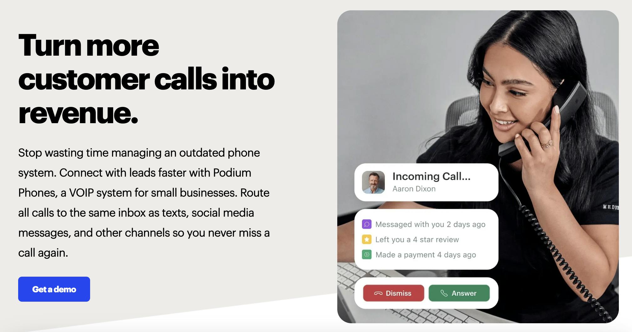 According to a 2022 study, 69% of customers still prefer to speak over the phone for customer service-related conversations over other channels such as chat and text. Podium has a Voice Over Internet Protocol (VOIP) system for small businesses which helps them route all calls to the same inbox as texts, social media messages, and other channels. It also lets users see calls in the context of customers’ messaging history including previous texts, Webchats, and other customer communications.