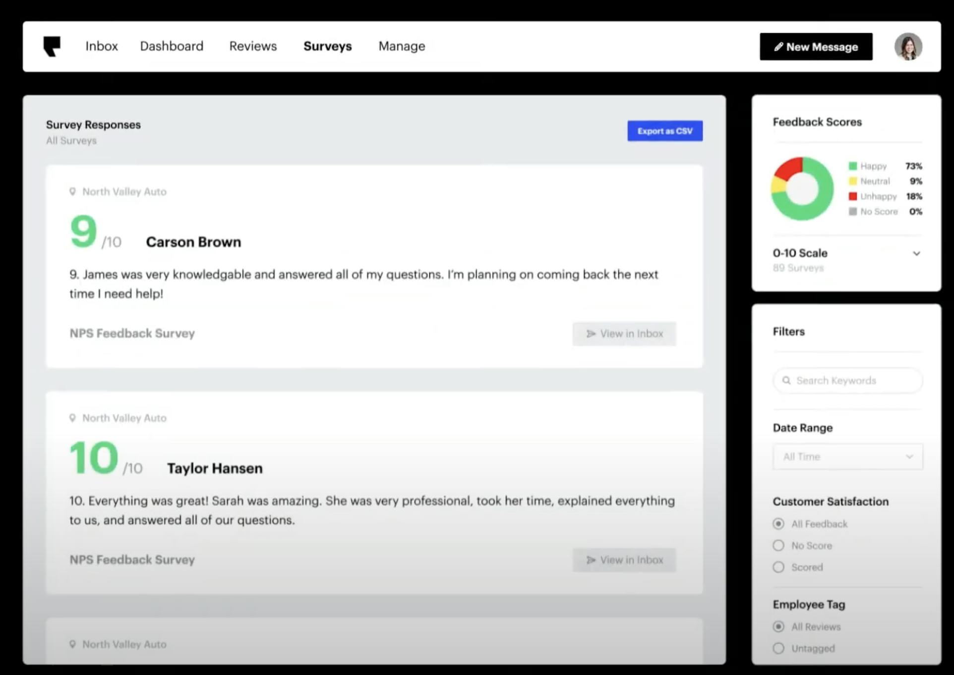 Podium allows businesses to survey customers directly through text messages to arrive at an NPS score and receive feedback on the customer’s experience. Podium’s survey feature allows businesses to survey customers without emails or links with two quick text messages, i.e. “surveys that feel like conversations”, with the intent of reducing friction and response time while increasing response rate.