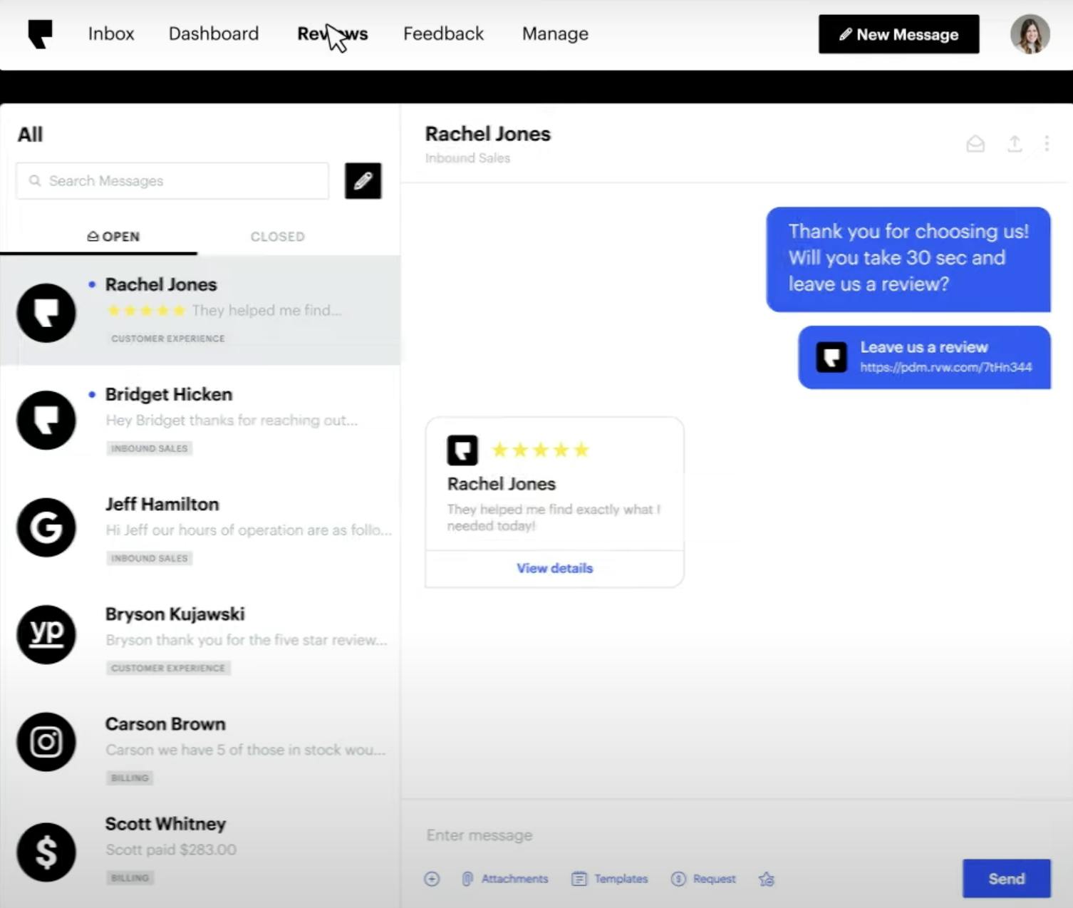 Podium's messaging platform enables businesses to communicate with customers through various channels, including text messages, website chat, and social media messaging. Customers engage with companies across dozens of different platforms and through many different mediums, so Podium aggregates all of this into one dashboard. Podium therefore gives small businesses one centralized inbox where they can see and respond to messages across all the platforms and channels where they are active. This feature is intended to help businesses to engage with customers, answer inquiries, and address concerns in real time.