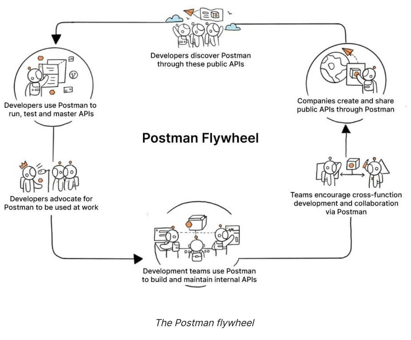 Postman attributes the growth of its global user community to a construct it calls the “API network effect.” In observing companies that leveraged an API-first approach, the company learned that many of them follow a typical cycle of Postman adoption.