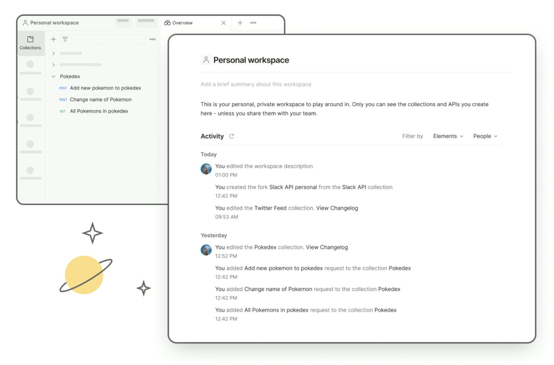 Personal workspaces are designed for individual-focused work and offer synchronization across different Postman instances and versions. Users can restrict access to APIs, collections, and other elements in private workspaces.