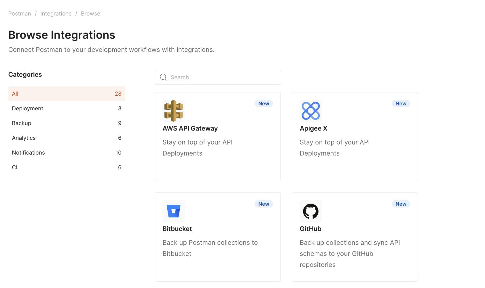 As of January 2024, Postman has over 30 integrations across development, testing, monitoring, visualization, and documentation, among other categories. These integrations allow users to connect Postman to their API workflows with integrations for popular third-party solutions. It provides native support for various continuous integration and continuous delivery (CI/CD) tools, allowing developers to view build statuses and trigger new builds directly within the platform. Additionally, the Postman API and open-source technologies offer extensibility and customization options for integrating with different development environments. Some examples of pre-built integrations include: