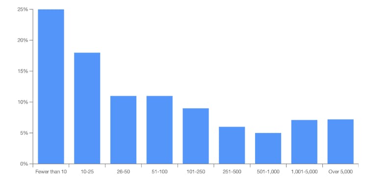 Postman’s API management system simplifies rapid scaling and software development for smaller customers. As a result, many of its customers are organizations with employee counts under 50. Conversely, larger organizations are more likely to be heavily reliant on internal or partner-facing APIs. In particular, 40% of companies with over 10K employees report having >250 internal APIs. Though predominantly used by smaller customers, in 2023, Postman reported its users’ company sizes to be bimodal around <10 and >1K employees.