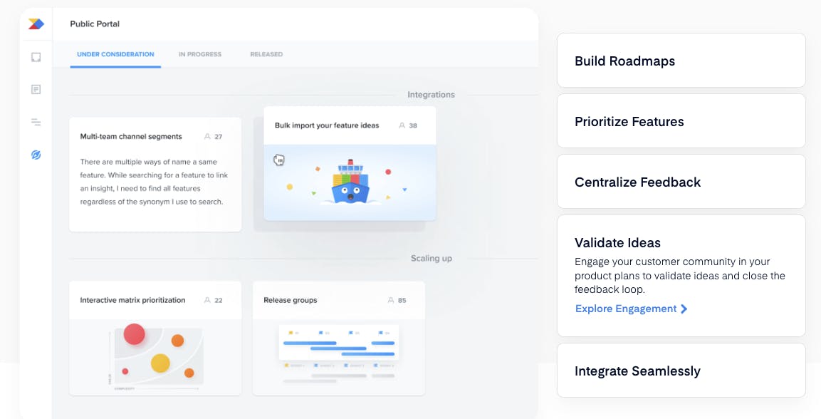 Productboard’s user engagement tool allows users to provide a customer-facing portal to quickly validate feature ideas and get feedback straight from customers. The feature is able to customize communication channels and feature views for customers depending on audience type while centralizing the intake of customer feedback within the Productboard platform.