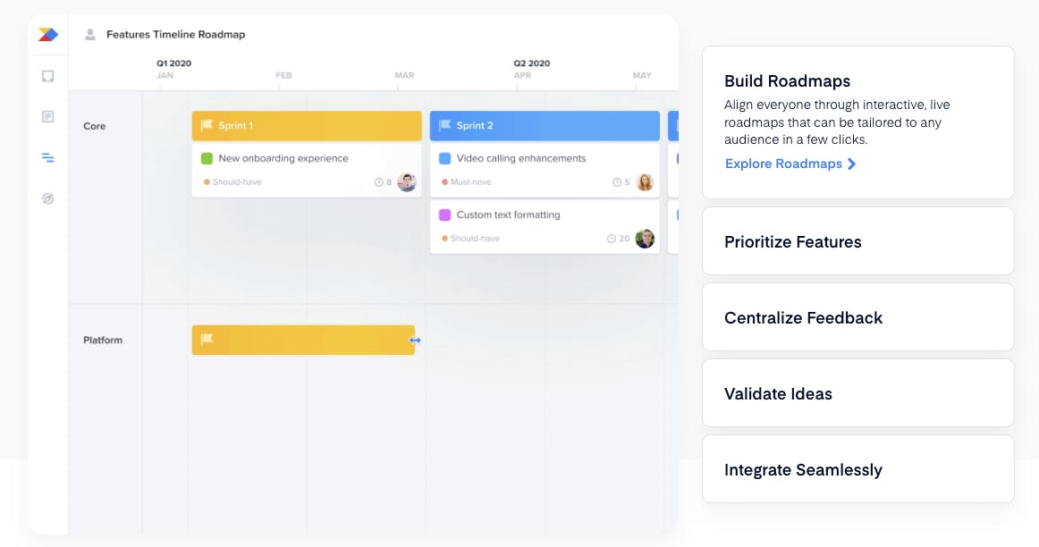 Roadmaps are Productboard’s core feature enabling product managers to select, customize, and share template roadmaps. Roadmaps are designed to be rooted in customer feedback, with options to build roadmaps around different product streams, timelines, and teams. The role-based visibility and ability to edit roadmaps offer flexibility in managing how roadmaps are communicated depending on the audience (C-suite to Go-to-Market to customer-facing).